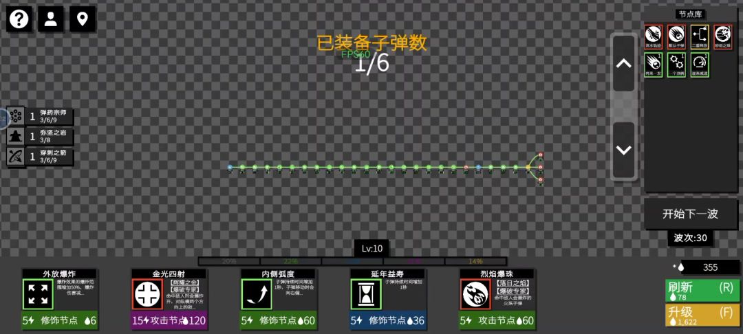 本来想弄水流的,结果搞出个这么个东西。主要节点还是要愈战愈勇、杀戮(我忘名字了,就是那个击杀敌人增加子弹持续时间)不用一定要水泡,用本来就无限穿透的子弹也行。后面打最终BOSS的时候我还加了积分快感,然后画面真的挺壮观的,就是手机有点卡。
