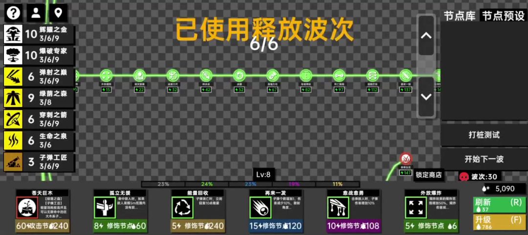 主要升级能量减半,血献祭 结点 核心:能量充足,一个顶两,昙花一现,身强力壮 补充:无限传透,连锁打击 前期过度:注入法力等补蓝,血养之籽、绿荫之森、生命之泉回血,再来三发补伤害(后期控制子弹数防卡)