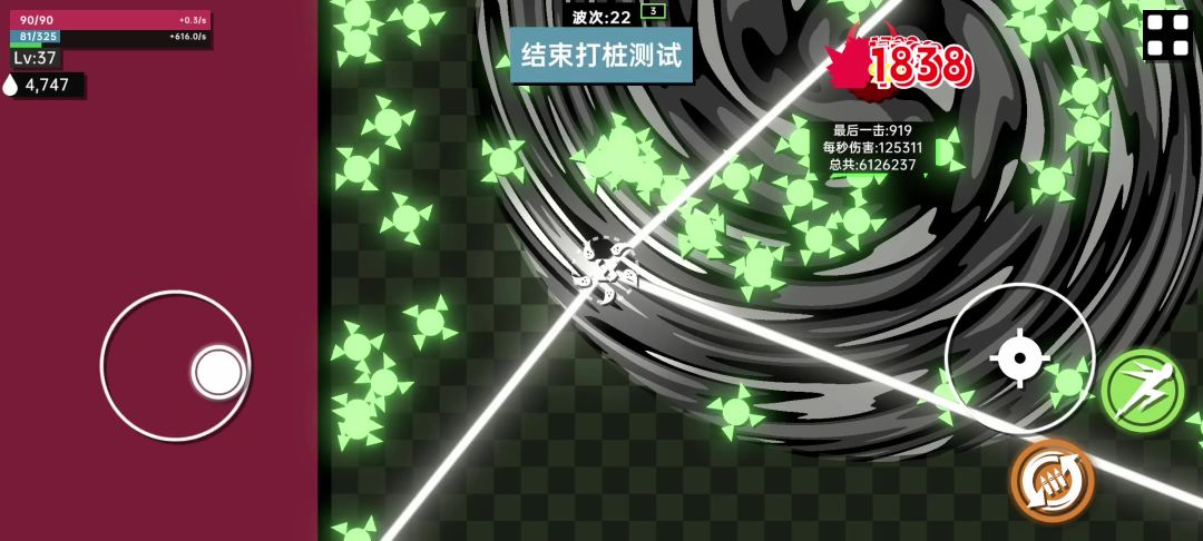 昙花一现的1000%伤害可以覆盖掉触发节点的-85%伤害,虽然子弹只能存在1秒但是可以用金碧辉煌的子弹高速的特点,快速利用命中触发接昙花一现和6子弹宗师多个子弹(还用了沉重扩散的+50%暴击伤害、身强力壮的+10伤害),天赋前期选攻击力加1,后期提升最大体力值来提升节点子弹属性和提升血量保生存,子弹宗师的垫子轮次就用来续航了,多个子弹可以多次触发法力注入