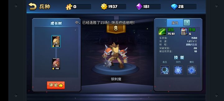 自从山岭被削成狗之后,牛头前期显得格外强势,大酋长的一技能粉碎(攻击时对250范围内的敌人造成100点真实伤害,最多影响三个单位)和他的二技能图腾祝福(血量低于30%时获得100%魔抗,持续2.2s),使得他是一个相当优秀的半肉半输出(面对欧洲牛简直分分钟想砸手机好嘛!)接下来说几种面对牛头的较好的应对方法:①如果你出门是一个队长(步兵升一级)的话,那么你可以选择直接生成总指挥然后再加一个队长,用来分担牛头的伤害,因为牛头的范围伤害是三个人平分的,所以总指挥这样优秀的散肉可以很好的抵抗牛头的输出。②直接补后排魔导师(火女升级而成),或者出一个山岭升级成的树妖,二者的技能都可以减掉牛头的攻速,从而降低牛头的伤害。
