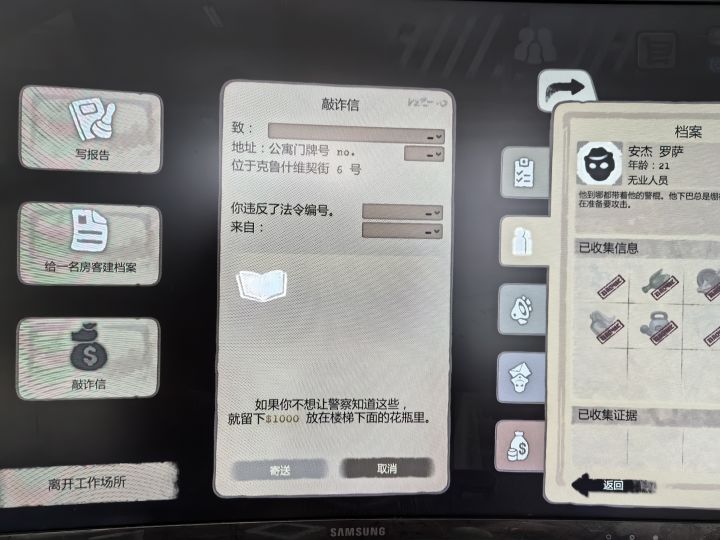 端游和手游有个究极致命的差别,端游的敲诈和建档,必须!!一个一个的点!!!具体来说,端游敲诈必须选对包括名字、房号、违规物品对应的条令号和发布日期在内的所有信息,每一个能敲诈的证据,都需要重复一次该步骤,如果有10个证据能敲诈,以上步骤需重复10次,否则一次性提交10个证据只能得到一个的钱(1000元)。建档步骤类似,只不过可以所有物品一次性提交且给总金额。这赚钱成本跟手游选择就能提交压根不是