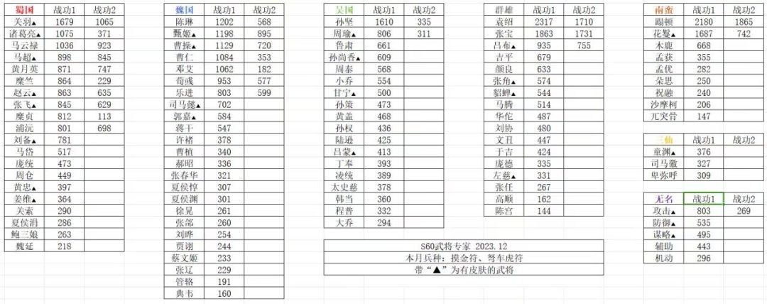 感谢玩家“随影行者”为大家整理的12月份的战功表格,冷门和热门武将的差距还是比较大,大家可以参考此表格,制定合理的策略,说不定就能用较低的战功获得自己心仪的专家。今天是2024年第一天,祝大家元旦快乐。#单机游戏