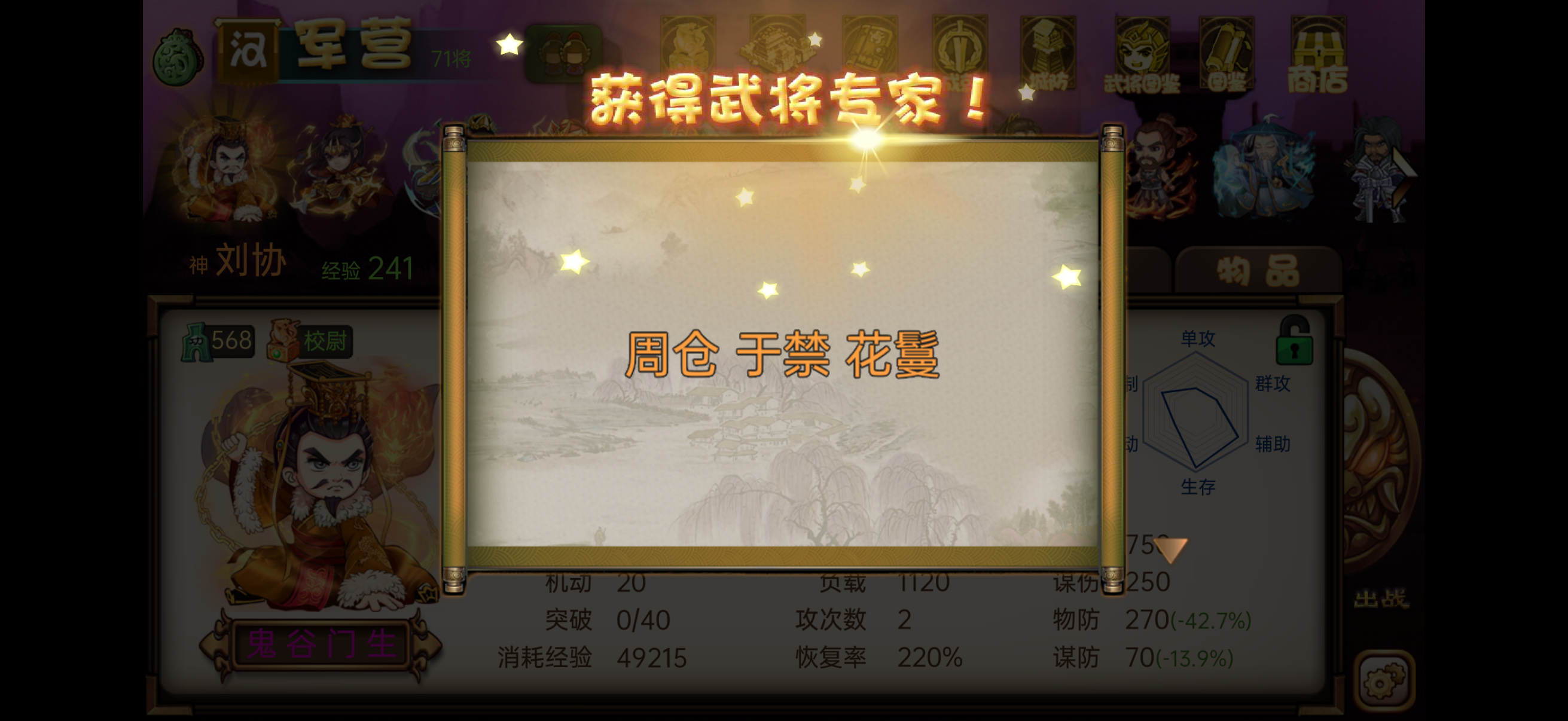 在更新这个版本之前介绍《过关攒将》时总是用“接近百将”这样的用词。在这个版本新增了两位新武将后,在排除无名武将的情况下《过关攒将》武将数目已经达到了101名,这也算是个里程碑版本,记得第一个版本出来的时候只有21名武将,经常有玩家问咸鱼"XX武将什么时候出啊?",后来发现这样的问题我自己也回答不了了,因为好多原本以为不会出的武将都已经出现在游戏中了,只能这样回答了:只要大家不弃,您希望的武将有一天