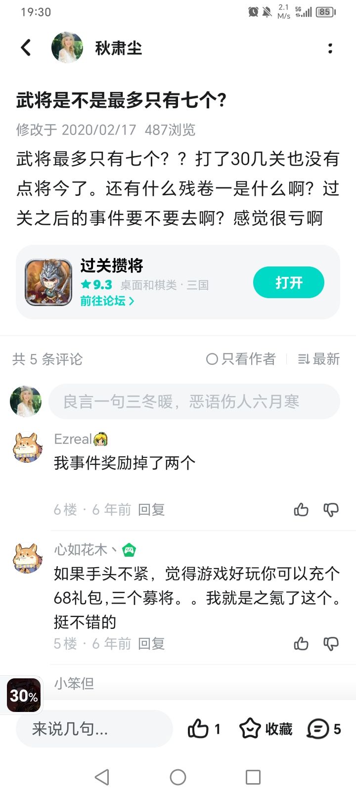 很多年以前玩过,那个时候还叫闯关杀,好像还挺难的,只有七个将,有次更新炸档了加上手机也坏了就没玩了。去年重新玩了,还挺好的,600多关了最近才知道两个难度差别挺大的,但是舍不得陪了我很久的人,也不太想开新档了,估计以后身上资源会多到爆炸吧,一出新将就能立刻觉醒满级那种哈哈哈。说多了,简单评价下新年礼物 ♥️A♦️A鞠躬尽瘁,死而后已♠️A大魏铁壁,不动如山♣️7