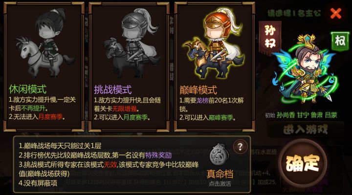 下次新版本更新中,在难度选择中将新增一个“巅峰模式”,该模式也会同时新开一个排行榜,下面就给玩家们介绍下新增的模式。 解锁条件:获得1次龙榜前20名。 特殊规则: 难度同挑战模式一致。 巅峰战场将在30关就开放,并且最高有30层(前12层会降低官职需求)。 龙榜获得的专家在该模式中不生效,该模式的专家将在巅峰榜中获得。 该模式没有屏蔽项。 巅峰榜规则: 奖励同龙榜一致。 巅峰