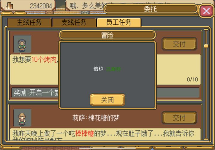 游戏攻略(不剧透)1.开局右上角时钟可以加速游戏(早发现早享受),金币连雇佣都不够时可以点宠物会加金币,支线任务中的前两个两个限时任务可以退出游戏直接更换。2.图一上面可以装备冒险道具药品(带特定道具可以吸引隐藏怪,具体可以在论坛里搜“食物攻略”),右边属性上的❓可以点开查看属性的具体作用。3.图二中右下角怪物显示的当前地图的怪与boss(不包括该图的隐藏怪),资源显示的是该图的树,矿,和宝箱