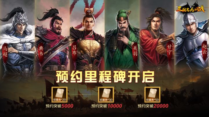 穿越时空的号角已经吹响,一场关于智谋与勇气的较量即将在《三国志之九州战》中展开。现在预约即可锁定丰厚奖励,助各位主公在乱世中一统江山!预约里程碑专属福利预约人数达5000奖励:奖励内容:招募券*20预约人数达10000奖励:奖励内容:招募券*30预约人数达20000奖励:奖励内容:招募券*50 【活动时间】即日起至游戏公测 *所有奖励,将在公测开启后视实际达成进度于游戏内通过邮