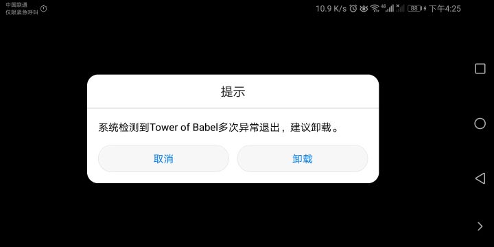 刚装完游戏,打开后系统提示这游戏多次异常退出,建议卸载。点击取消后游戏闪退。然后每次都是一打开就闪退