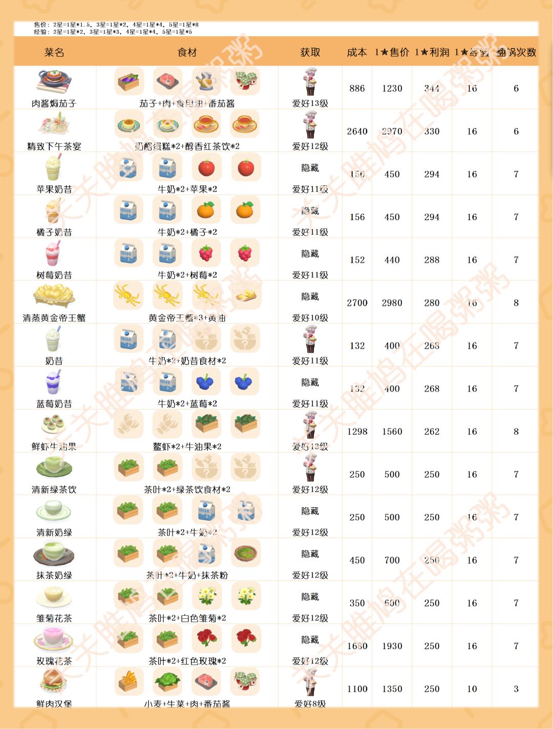 感觉新手前期攻略还是少点,走了不少弯路,并且是在临近潮流季入坑,玩的身上钱紧紧巴巴的,分享一下目前总结的心得。 爱好方面的优先度,烹饪>园艺>钓鱼>捕虫=观鸟>养猫 以上排行是为积攒前期资本为主要 这游戏赚钱主要靠烹饪卖菜,而卖菜的利润影响最大的就是菜品星级,星级的波动影响最大又是烹饪等级,所以烹饪为主要升级爱好,解锁的菜单固然重要,但更香的是高星级菜品概率提升 食材星级也会影响菜品星级,但影响没