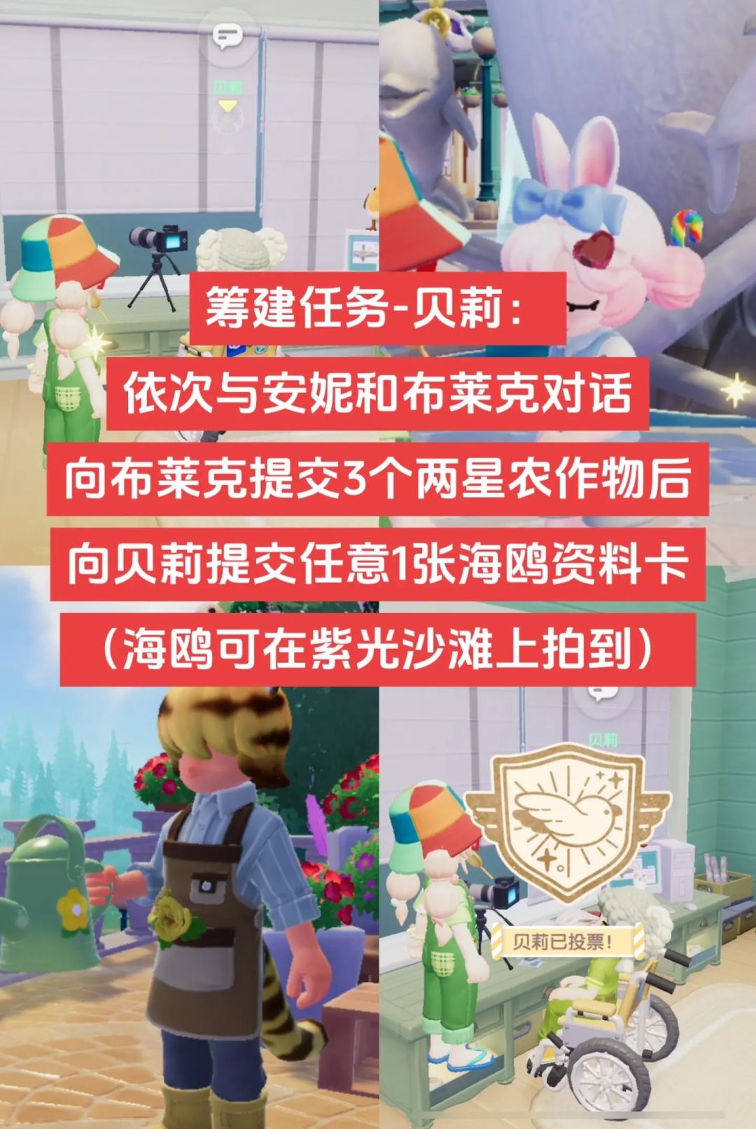 🏕️任务包含NPC:贝莉、琼女士、帕蒂、凯茜 🌱贝莉:接到贝莉任务后,去找安妮对话,接着去找布莱克对话,此时需要向布莱克提交3个两星农作物(这里可以在工作台上制作化肥,在家园种植番茄后使用化肥,这样就可以快速得到两星农作物)。之后还需要向贝莉提交海鸥的一张资料卡,海鸥可前往紫光沙滩拍摄。 🐱琼女士:接到琼女士任务后,需要按照地图指示依次去花田找弗妮、去温泉山找艾瑞克、去东边林地找帕蒂。在去NPC位