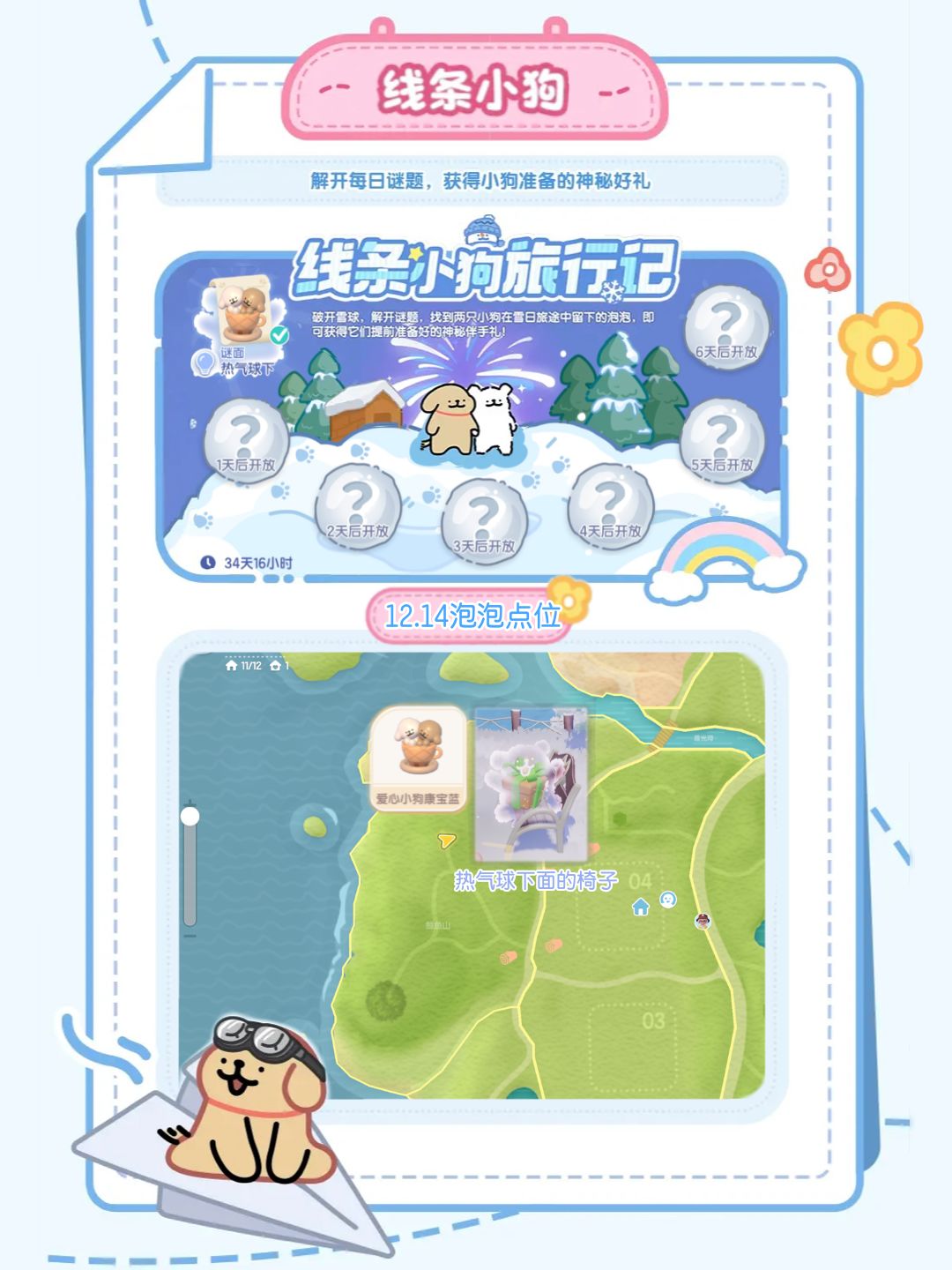 ⭐位置见后面图片哦! 第一天: 谜面:热气球下 奖励:康宝蓝食谱 第二天: 谜面:秘密小岛 奖励:线条小狗贴贴地毯 第三天: 谜面:海钓时刻 奖励:线条小狗冲呀地毯 第四天 谜面:三口之家 奖励:马尔济斯托特包 第五天 谜面:哆来咪啦 奖励:小金毛托特包 第六天 谜面:新朋吱吱 奖励:嗨皮马尔济斯相框 第七天 谜面:今天是狼 奖励:嗨皮小金毛相框 #心动小镇 #心动小镇线条小狗联动 #线条小狗在小