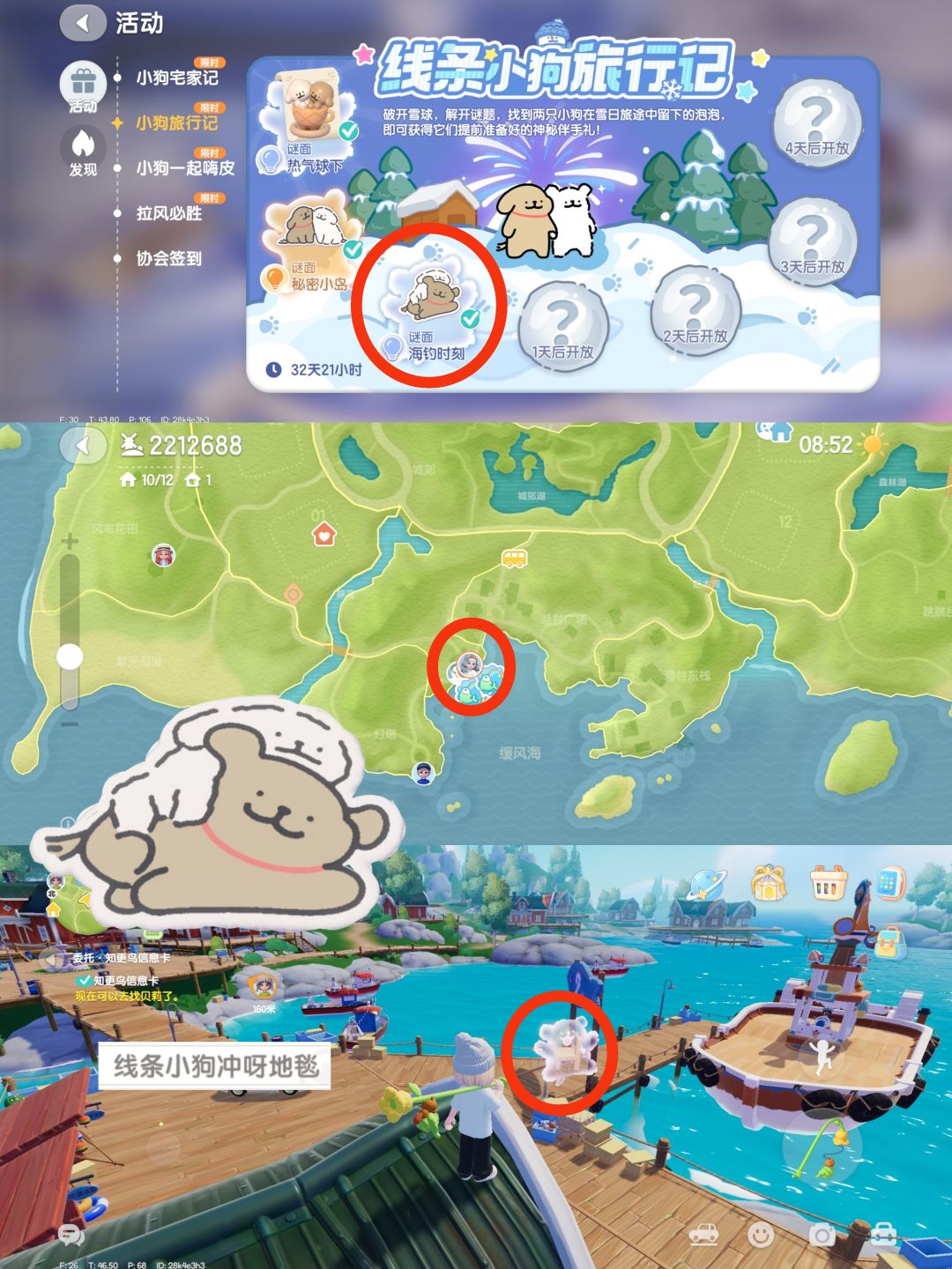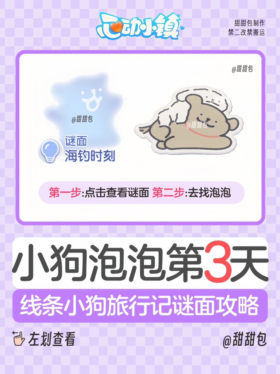 ⭐️宝宝们记得先点查看谜面!才能看得到对应的泡泡哦 ⭐️第1天谜面:热气球下 奖励:爱心小狗康宝蓝食谱 ⭐️第2天谜面:秘密小岛 奖励:线条小狗贴贴地毯 ⭐️第3天谜面:海钓时刻 奖励:线条小狗冲呀地毯 #心动小镇 #心动小镇线条小狗联动