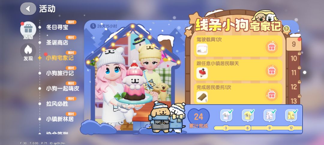 线条小狗来啦!话不多说,直奔主题!第九天极简攻略! 宅家记: 1.用载具1次。 (任意车子) 2.完成委托任务1次。(任意任务) 3.跟居民聊天。(和任意居民”聊天) 冬日寻宝: 在沙滩边上的救生员附近。 林里茶馆在镇中心小喷泉旁边,每天两种食材限购200个 萤石溜溜木在7/11号房子门前。 兑换码 祝大家线条小狗活动游玩快乐,圣诞快乐! #心动小镇 #心动小镇创作计划 #心