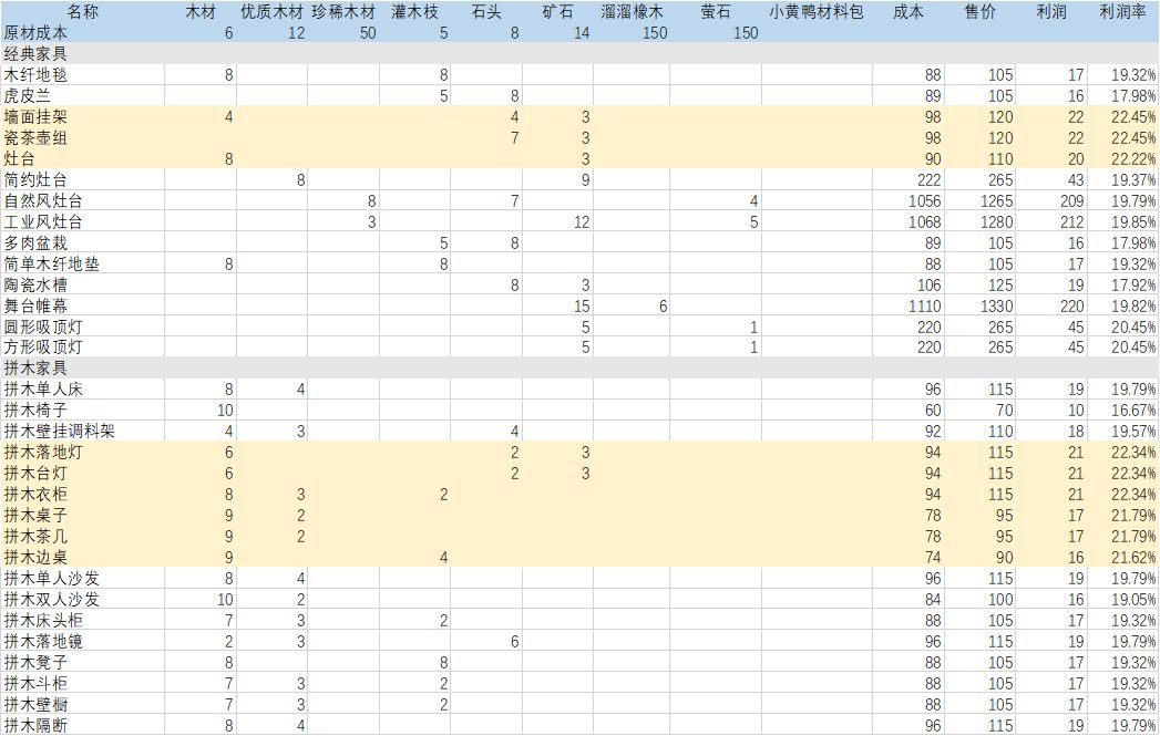 ⭐结论:墙面挂架,瓷茶壶组,灶台,拼木衣柜、台灯、落地灯、桌子、茶几、边桌,跑道塑胶垫, ⭕️这些标黄的家具利润率大于21%(相较于单卖材料,不考虑体力成本和时间成本) ✅️可以各种木材做拼木衣柜,石头和矿石做瓷茶壶组,灌木枝拿来做跑道塑胶垫。 ❌️其它利润率低的建议不要做,尤其不要拿溜溜橡木和萤石做家具来卖,很亏。其它虽然差的不多,但积少成多。 🔅9.15更新: 1、新增其它所有可制作家具