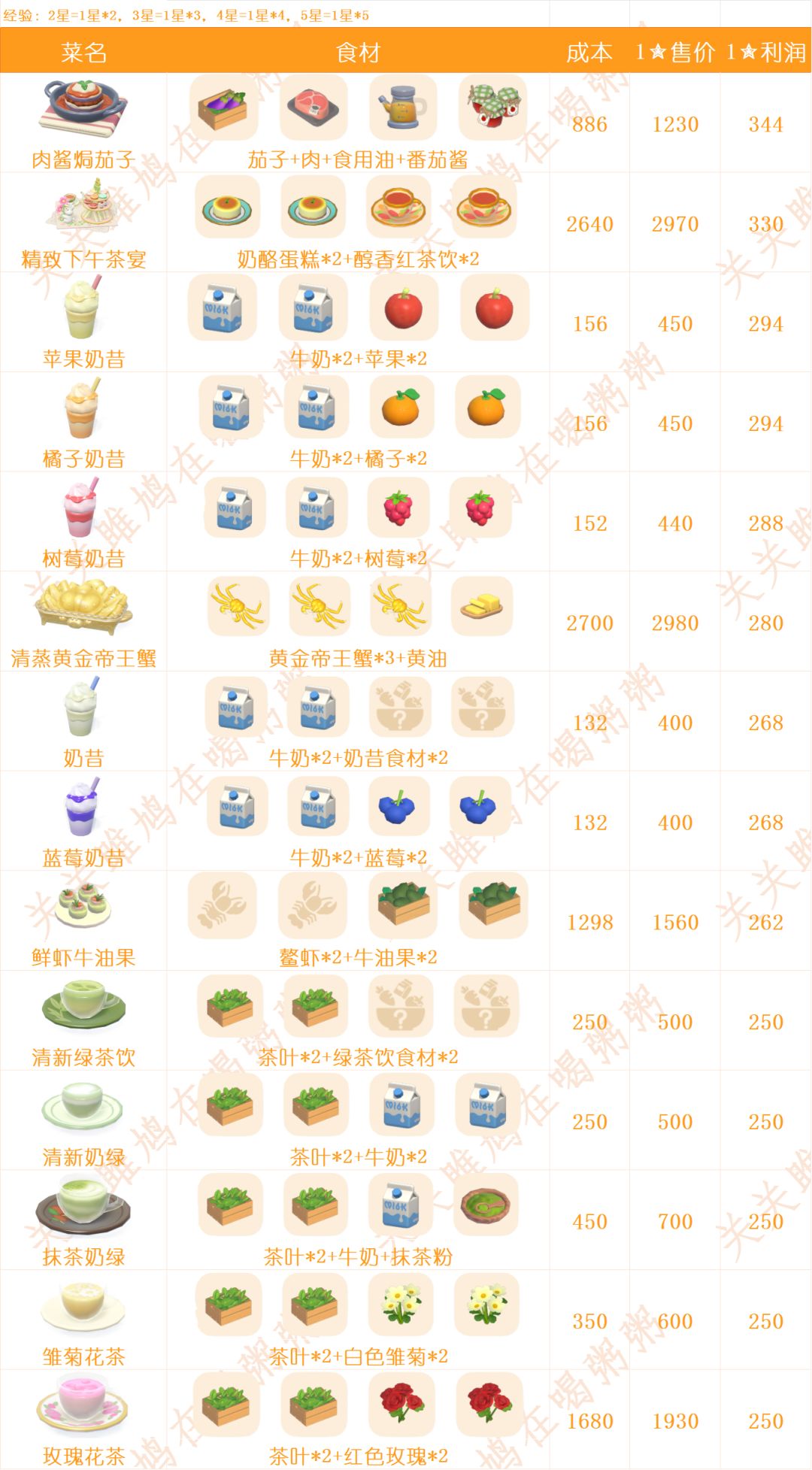 成本价计算采用制作原料在二世处售价。牛奶等需在厨师处购买物品采用二世售价,非原价(太折腾了,不想挨个对[表情_豹哭]) 肝金币建议做椰子水,找俩相邻的潮流季炉子,上锅点一次后就跳另一个锅开煮。 此表所有菜品及原料均为一星。 为标明水果均为蓝莓,鱼均为沙丁鱼。 我这俩库存多[表情_捂脸哭]其他鱼类售价自行找钓鱼赚钱攻略贴 空格处为本人已解锁但没库存的菜品及原料#心动小镇 #心动小镇攻略