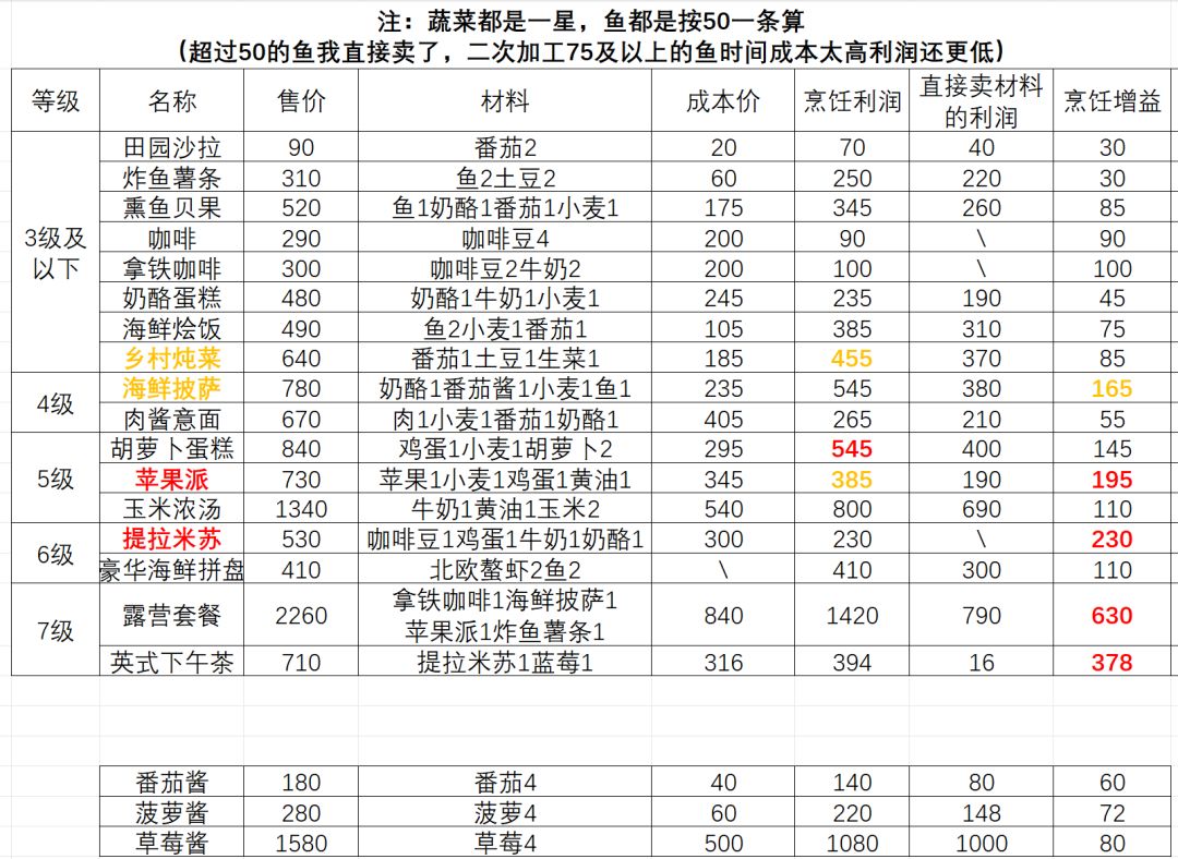 总结:六级前唯二真神海鲜披萨(4级烹饪)和苹果派(5级烹饪)!六级前就做海鲜披萨、乡村炖菜和苹果派!消耗50鱼目前只推荐海鲜披萨,因为目前解锁的几个鱼菜谱都要消耗小麦,但只有海鲜披萨利润最高!(刚玩菜谱还没解锁完,仅供参考) ~~5级菜谱苹果派非常好用!!适合不常上线懒得钓鱼或50鱼不够用的玩家,只需要种小麦就可以了!其他材料非常简单!(并且像这种需要买材料的经常会打折,利润只高不低!) ~~6级