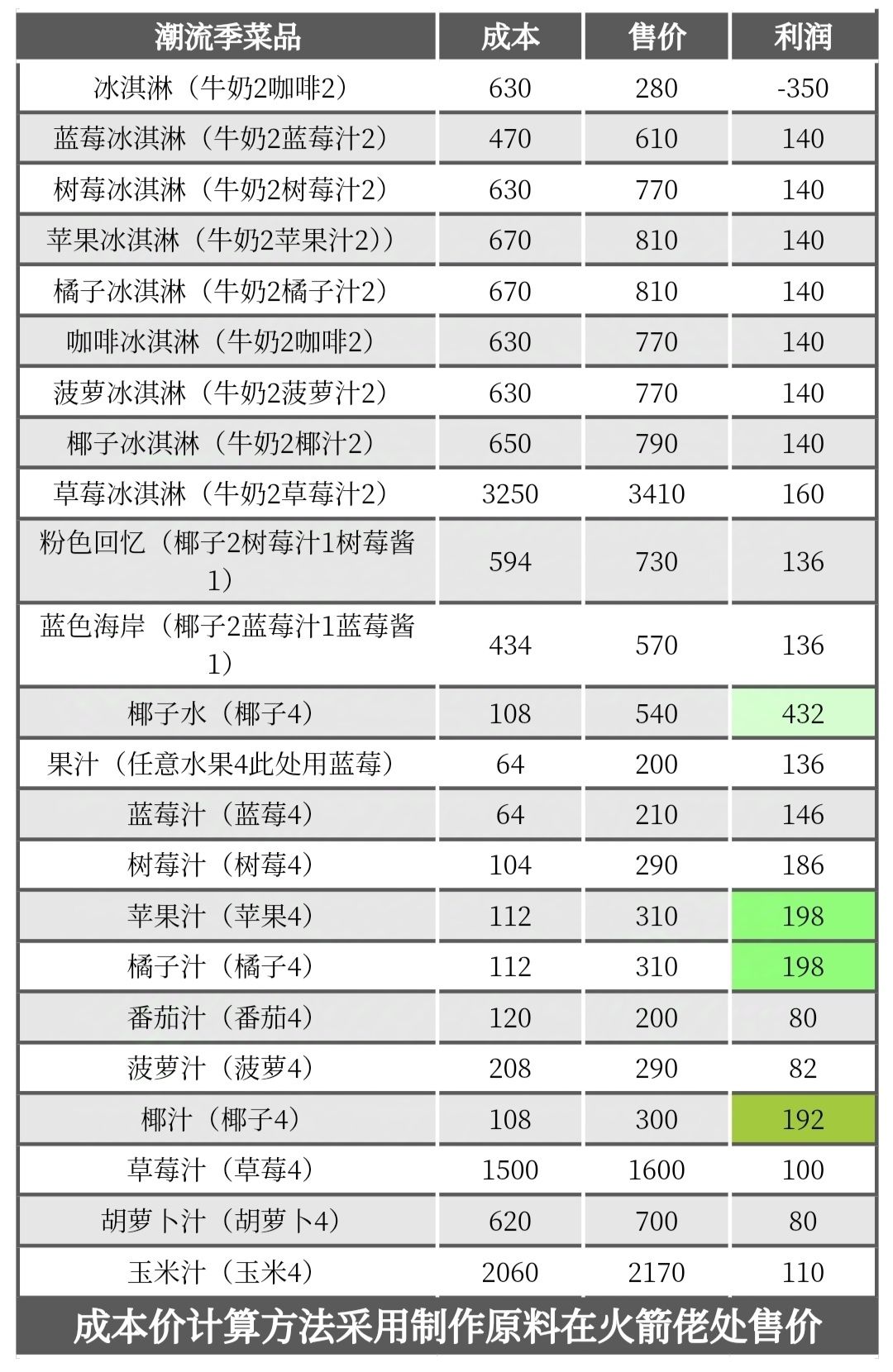 十级烹饪利润表格