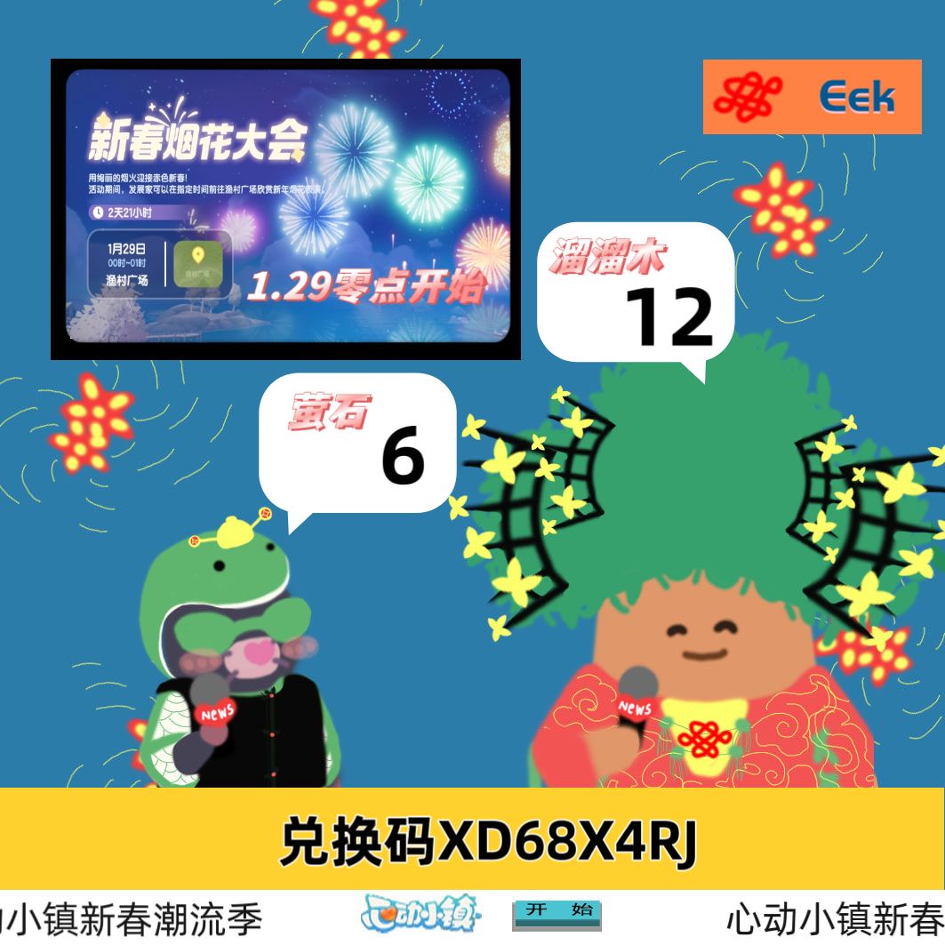 新年快乐各位 兑换码:XDX4RJ91 NEWYEARBABU 萤石在2号位,溜溜木2在号位。 [心动小镇_点赞]新乐器竹潇、新种子牡丹 [心动小镇_震惊]悬挂鞭炮虫、爬行鞭炮虫、飞行鞭炮虫 [表情_星星眼]本周泡泡位置 等等,你是在问我黄金锦鲤吗? 我找万尼亚师傅问问哈 感谢阅读此次的Eek资讯。#心动小镇 #心动小镇创作计划 #心动小镇新春季 #新春季攻略征集