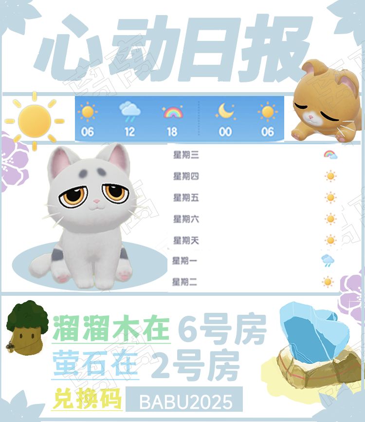 今天的 彩虹朵朵在小镇广场的公交站旁 ⭐溜溜木在6号房⭐ ⭐萤石在2号房⭐ ⭐ 兑换码BABU2025⭐ ⭐18点直接在评论区复制⭐ ⭐12.28-1.3粉色泡泡详细位置如图⭐ 🐕线条小狗旅行记小狗泡泡详细位置如图🐕 🐟海钓🐟【12:00-12:10】【 21:00-21:10】 ⭐今天天气⭐ 12点有🌧,18点-24点彩虹天🌈 🌈彩虹天出没物种如图🌈 #心动小镇 #心动小镇日
