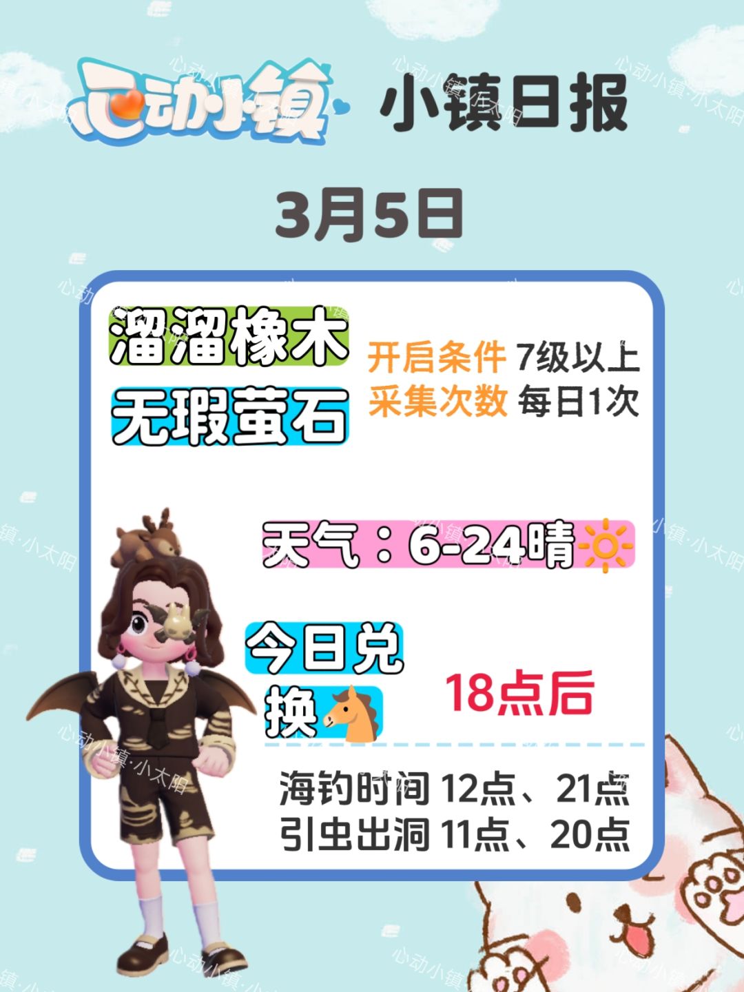心动小镇12月13日 1.溜溜木:11号(溜溜橡木) 2.无暇萤石:11号 3.今日礼包码:18点左右更新 雨天朵朵在文艺街 12.12捕虫事件(新虫),减少新食谱翻锅次数,12.14线条小狗联动,新载具,新抽奖,下雪天也暖和!1月份全新潮流季! 心动小镇QQ群:3890352 微信群:3246044 腾讯频道号:8xin8d8x8z #心动小镇 #2024TapTap年度游戏大赏 #心动小镇