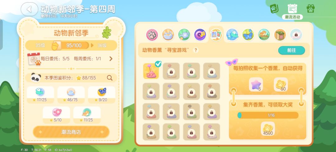 一、游戏日常: 1.萤石: 11号家园门前。 2.溜溜木:10号家园门前。 3.去服装店二楼给贝莉交鸟卡5张。 4.找小鬼抽20次卡,集金色图鉴。(需要20 万金币,量力而为) 5.兑换码:晚点评论出 6.下雨天朵朵在镇中心花园街小喷泉旁边(0点—6点) 二、动物新邻季日常 1.动物香薰和家具没拿完的去拿,16天全出了。 2.到厨师处买8种食材,各50个(食物没满星的,想要换活动商