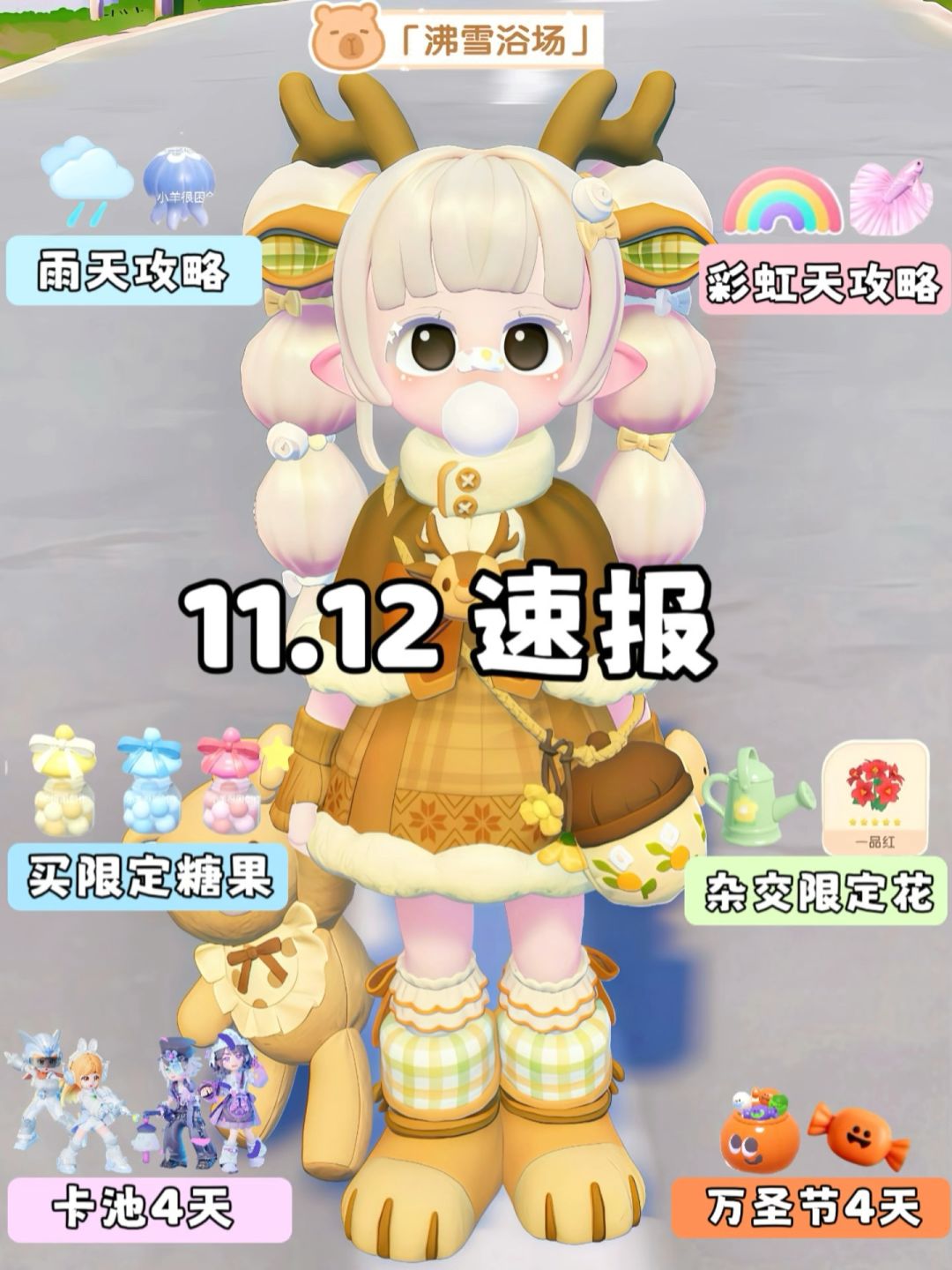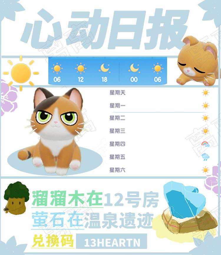 今日吉,宜采集萤石和溜溜木。 (兑换码XZ29LUV6) [心动小镇_微笑]彩虹天12:00-18:00(已实时更新) [心动小镇_点赞]本周泡泡位置 感谢阅读此次的Eek短讯。#心动小镇 #心动小镇攻略