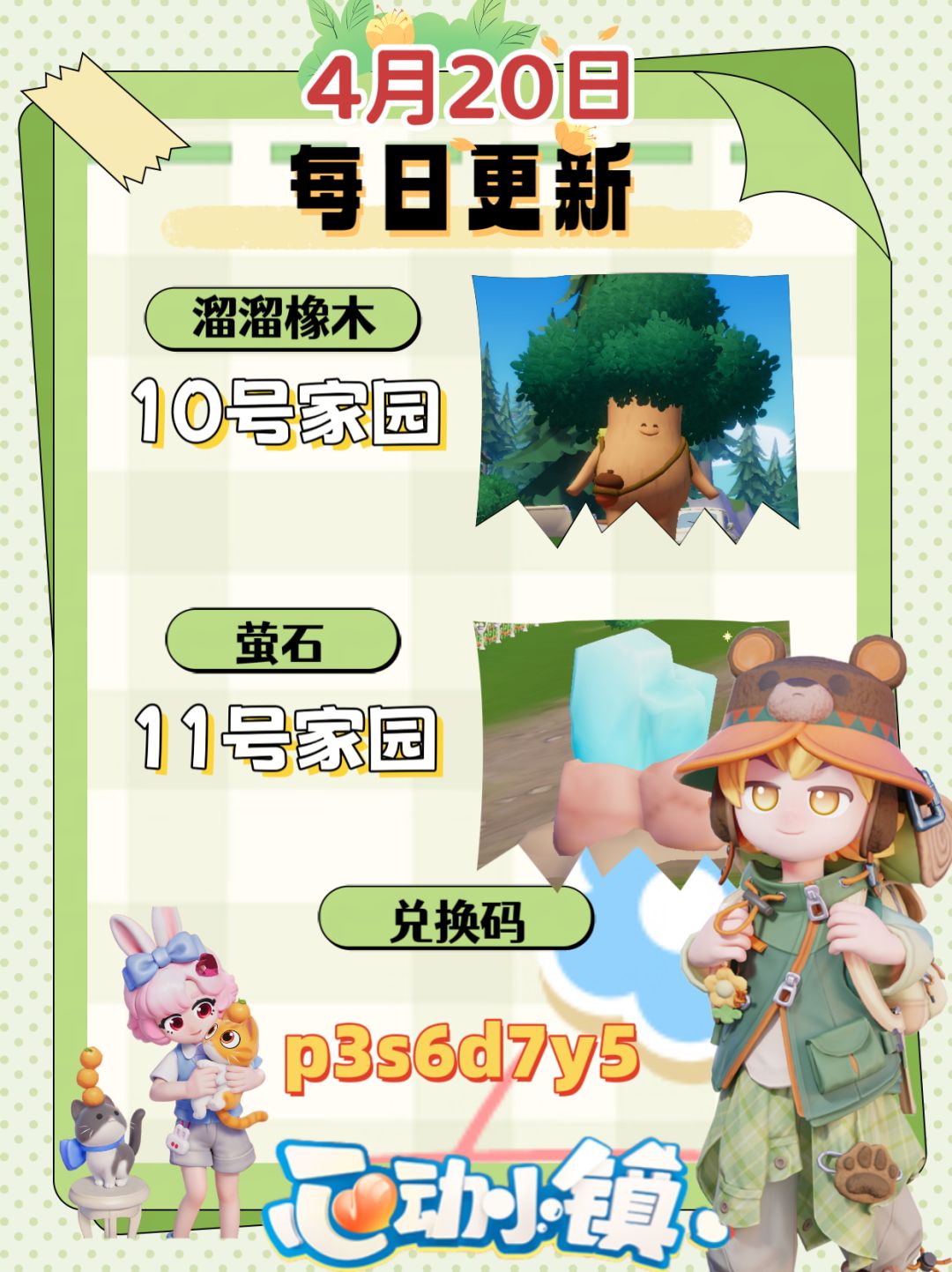 ✨《心动小镇》每日必看攻略!资源+兑换码一键get🌿 💌最新兑换码:p3s6d7y5 👉复制到游戏【设置-兑换码】领材料/满愿星/金币! 🌳溜溜橡木位置:10号家园门口 💎无暇萤石位置:11号家园门口 每天更新最新兑换码,关注+收藏不迷路。 #小镇庆典春野令 #心动小镇 #小镇庆典春野令攻略征集