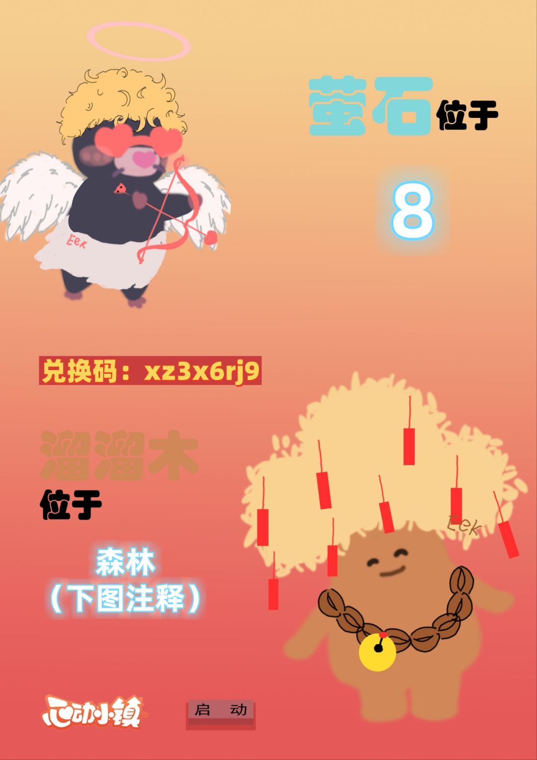 今天萤石在老家(遗迹里围着得卡拉巴拉那里) 溜溜木在12号房, 今晚兑换码是M2W3X7T5,记得在当天晚上兑换,本兑换码奖励包含若干个烟花和30个鸡蛋~ 寻找资源之前需各位完成“寻找星灵任务”~ 4/19线下活动,在成都那里举办 预计4/26小镇与奶茶鼠联动~
