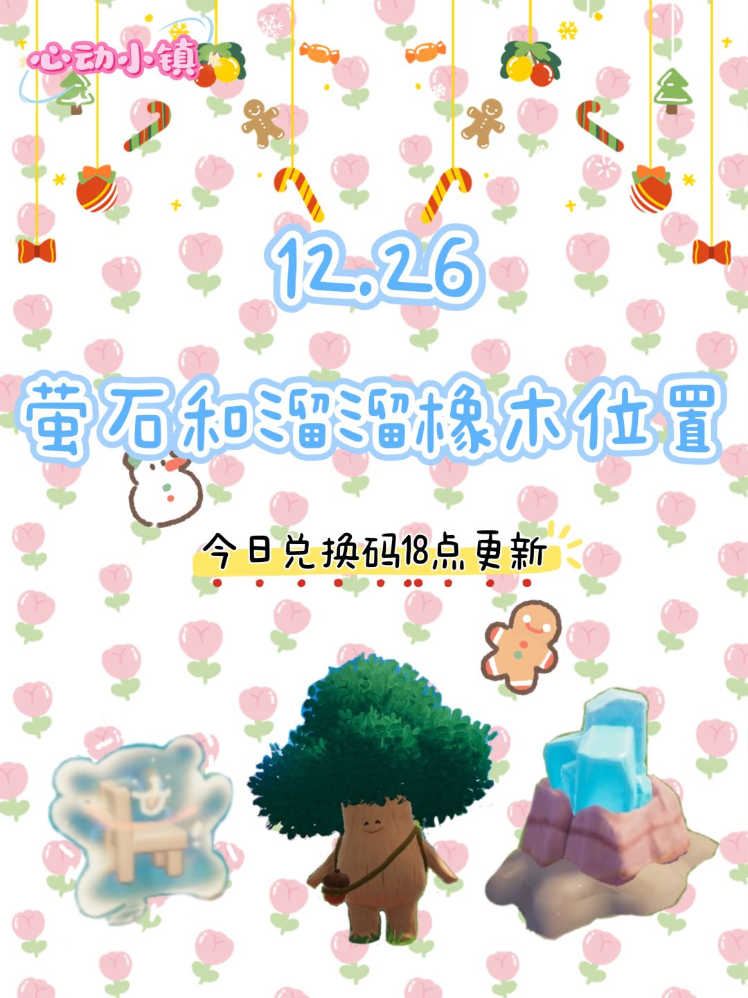 🧸兑换码:18点后更新 🌳溜溜橡木:7号房前 🌟无暇荧石:6号房前 【常驻活动 】 海钓 12:00 21:00 引虫出洞 11:00 20:00 泡泡机挑战 14:00 黄鸭跳跳台 15:00 异壳蟹捕捞行动 每日18:00 【香薰位置】 【一】粉色香薰 小鬼身后 家具泡泡 文艺街粉房子中间 【二】黄色香薰 舞台栅栏 家具泡泡 小黄鸭跳跳台终点 【三】青色香薰 舞台后方#小马宝莉心动小镇周年联动