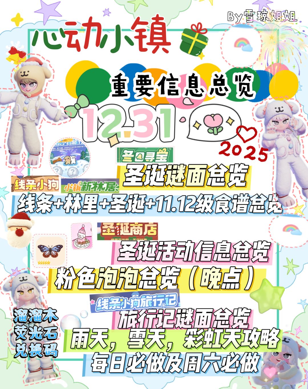 BYE2024 今天12-18下午下雪,18-24🌈,0-0:30烟花 溜溜木 7 萤石 6 🤎圣诞谜面 💛圣诞活动 🩵最新料理(林里,线条,11.12级 ❤️每日流水线 🩶粉红泡泡(12.28-1.3) 🤍线条小狗谜面 🩷林里主题店总览 💙引虫出洞信息 💜每天必做,每周六必做 💛雪天,雨天,彩虹天攻略 #心动小镇 #心动小镇线条小狗联动