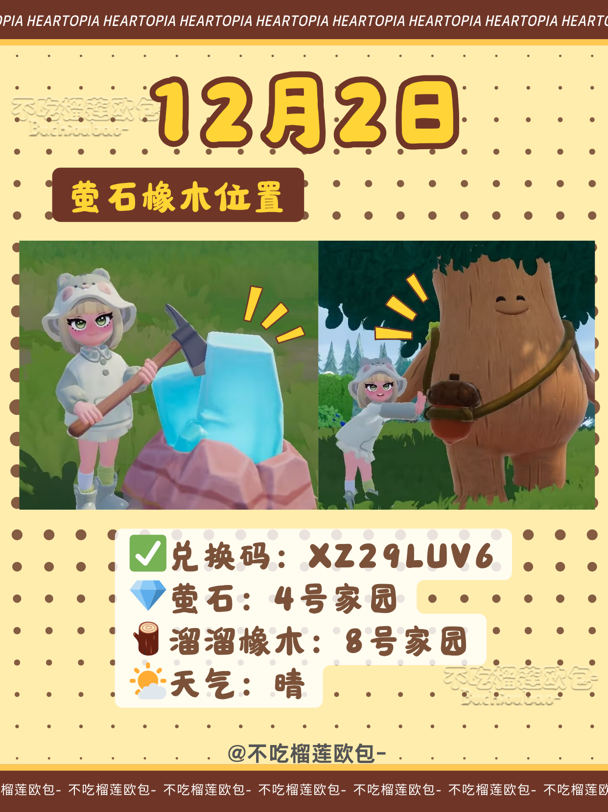 12月2日莹石溜溜木,4/8号房子门前。见图。 大家请关注我,日更。 12月5日起会开始更新无限暖暖攻略,有玩的宝们关注,一起玩。 下雨天朵朵在镇中心小喷泉那里(6-12点) 彩虹天花束12点更新 每日兑换码 还没 #心动小镇 #心动小镇创作计划