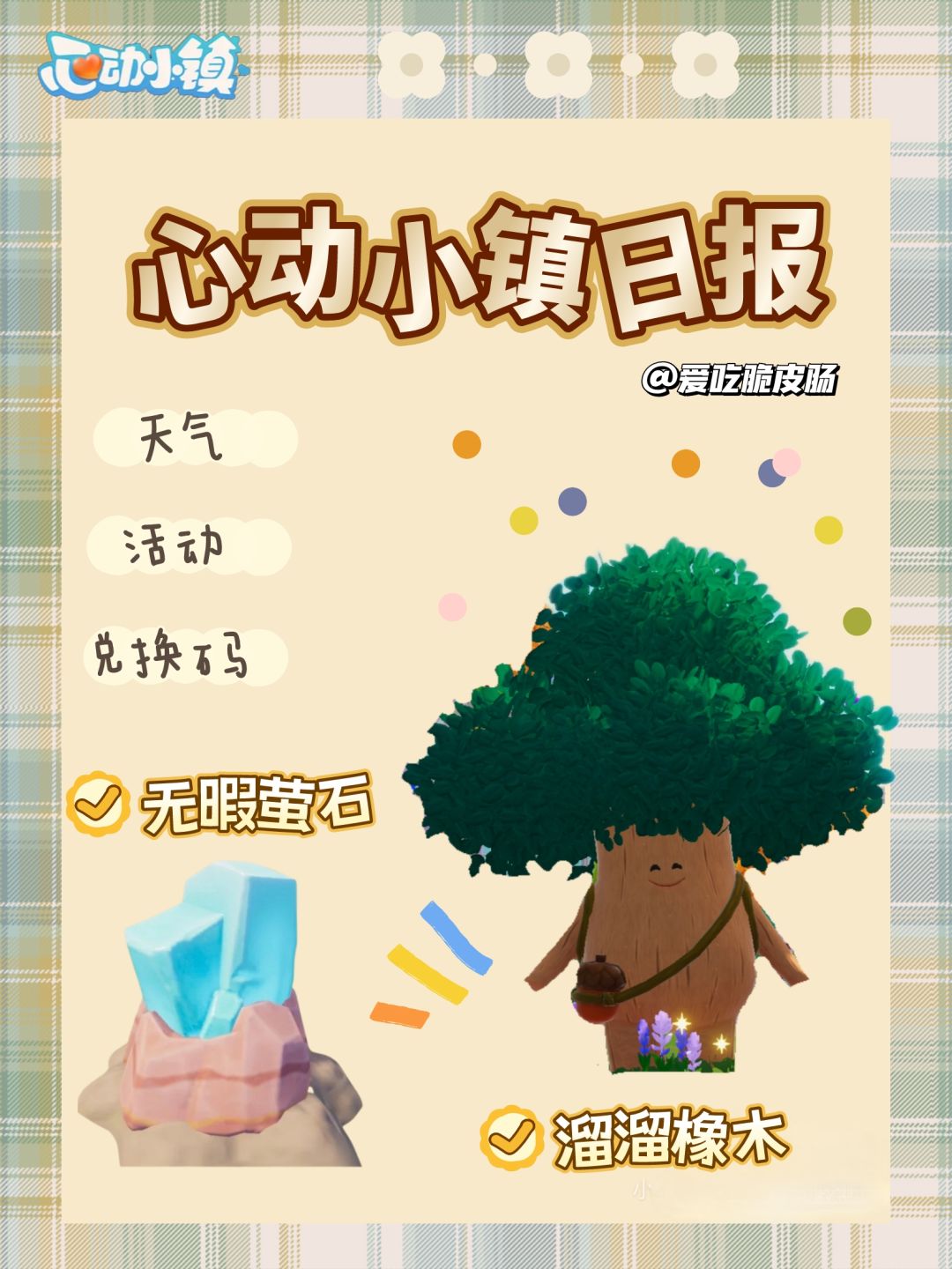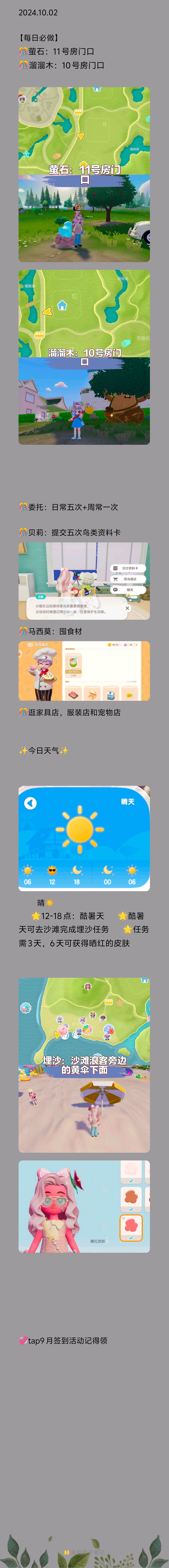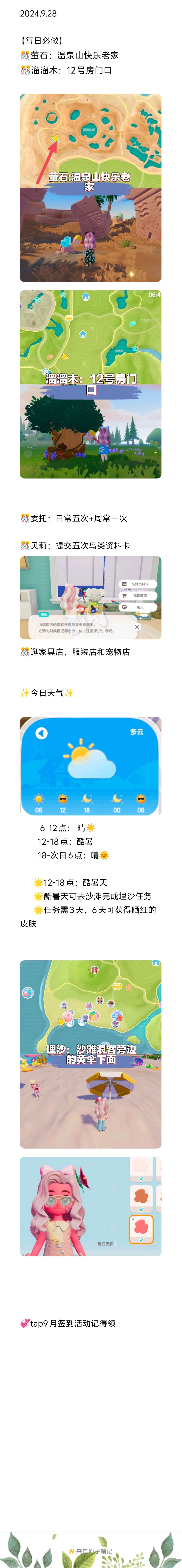 2024.9.28 【每日必做】 🎊萤石:温泉山快乐老家 🎊溜溜木:12号房门口 🎊委托:日常五次+周常一次 🎊贝莉:提交五次鸟类资料卡 🎊逛家具店,服装店和宠物店 ✨今日天气✨ 6-12点: 晴☀️ 12-18点:酷暑 18-次日6点:晴🌞 🌟12-18点:酷暑天 🌟酷暑天可去沙滩完成埋沙任务 🌟任务需3天,6天可获得晒红的皮肤 💞tap9月签到活动记得领 #心动小镇 #心动小镇