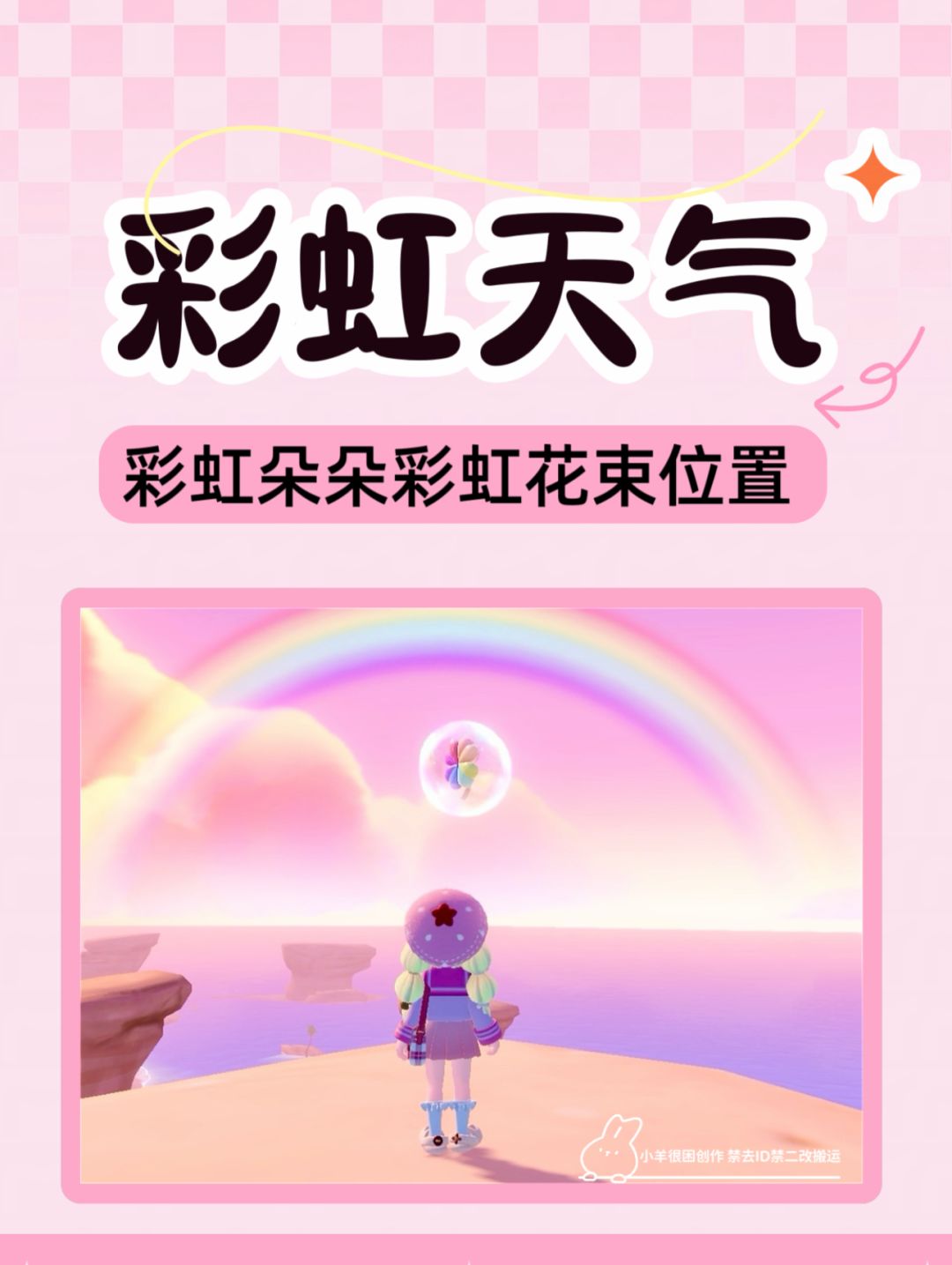 彩虹天气来啦 18:00开始 朵朵在旧海附近站着 花束在第三张图片高的石头上 一直长按跳跃跳上去即可 还有一束花在自己家门口 #心动小镇 #小镇奇灵夜季 #心动小镇攻略