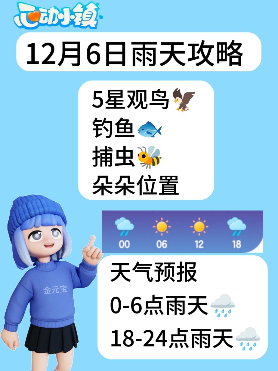 天气预报 0-6点雨天🌧️ 18-24点雨天🌧️ —————— 5星观鸟🦅钓鱼🐟 捕虫🐝 朵朵位置 #心动小镇 #心动小镇创作计划