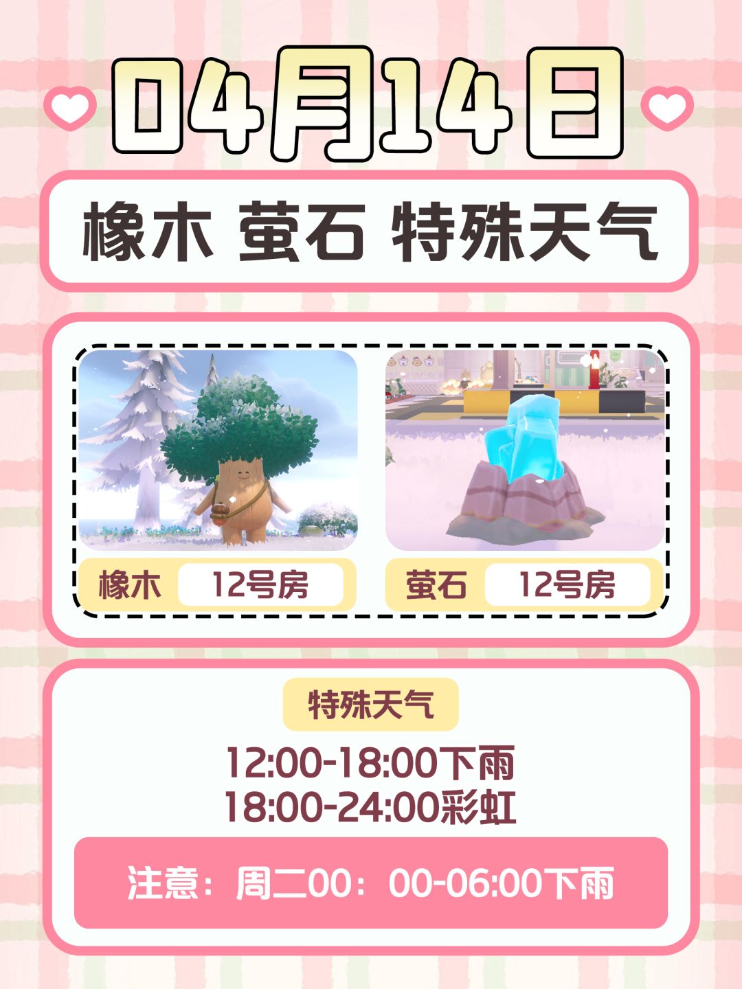 【橡木】12号房 【萤石】12号房 🌧️12:00-18:00 🌈18:00-24:00 🌧️00:00-06:00 #心动小镇 #小镇庆典春野令 #心动小镇创作计划 #心动小镇创想团 #游戏种草计划 #发现好游戏 #心动小镇溜溜橡木