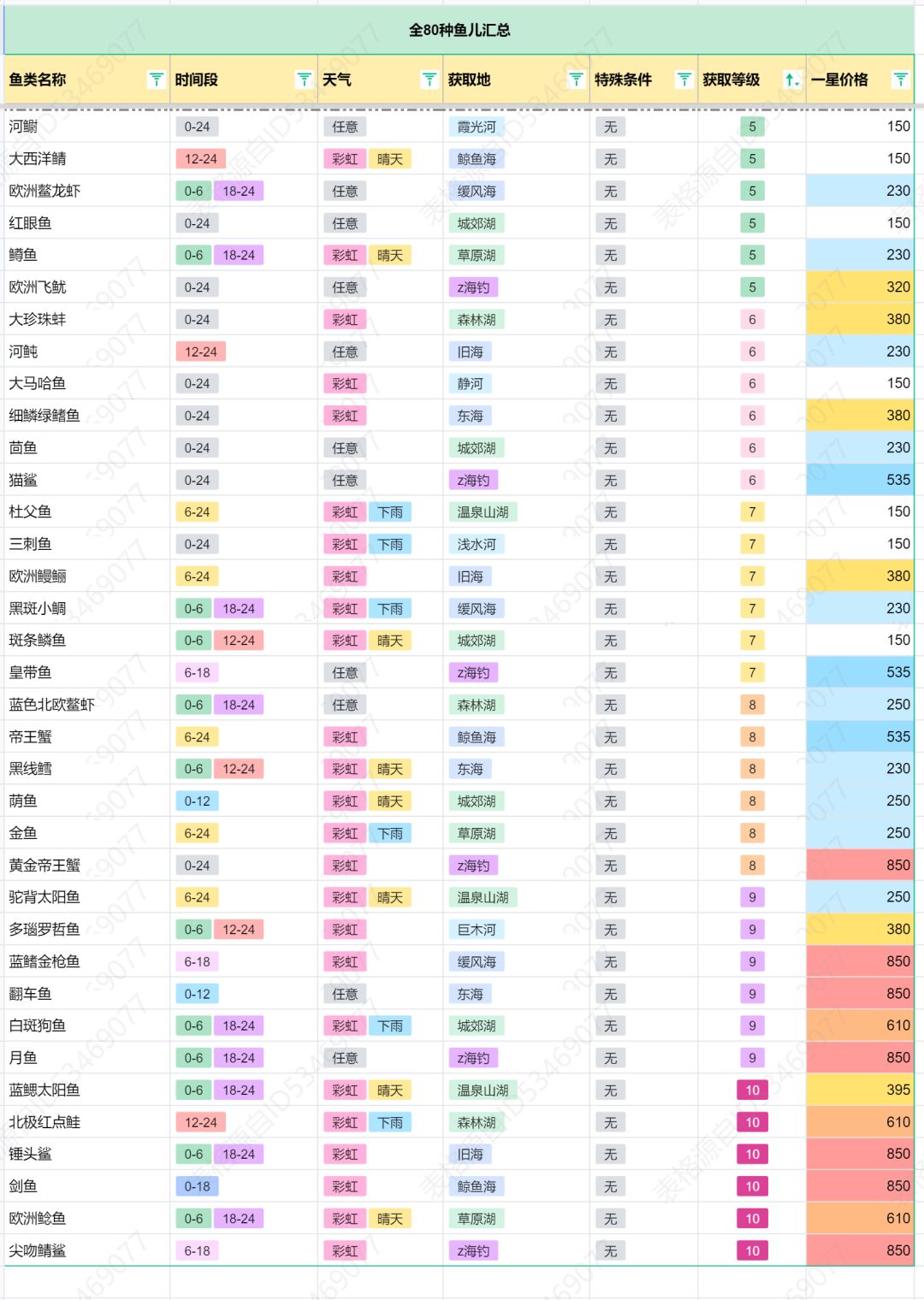 【全80种鱼,产出区域、获取等级、出售价格信息大全】 【更新彩虹日、晴天最佳钓鱼点,前往此贴查看: https://www.taptap.cn/moment/567841582389136292】 【末尾更新1-10级、不同流域的鱼种-可下载保存】 【8/4更新:调整北欧鳌虾、剑鱼的活动时间】 沉迷钓鱼赚钱不可自拔[表情_开心] 自己通过收集其他大佬们的一些数据, 整理出了一份【全80种鱼的产出区