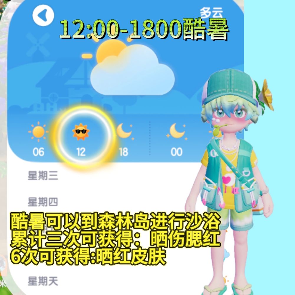 7月20日—8月15日,小镇会出现酷暑天气。 可关注手表中的小镇天气,在酷暑天气来临时,前往森林岛的沙滩进行沙浴。 达到一定次数后可解锁【晒伤腮红脸绘】和【晒红皮肤】。 △ 去年沙滩乐园季已获得的玩家,将不会重复获得。 #心动小镇 #小马宝莉心动小镇周年联动 #动物新邻季攻略征集 #心动小镇攻略 #心动小镇日常 #心动小镇1周年庆