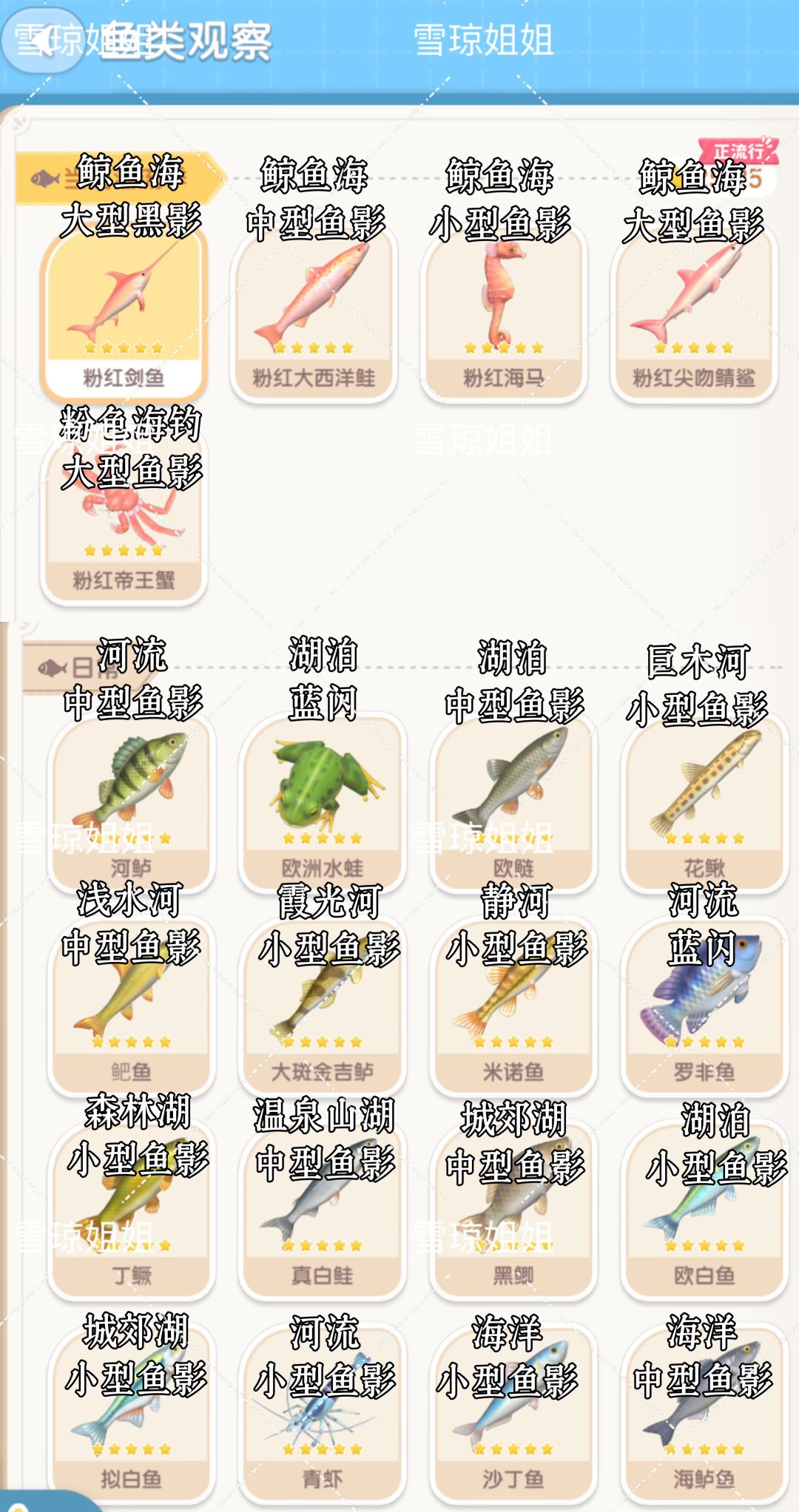 首先说一下鱼的图鉴怎么刷 初期直接怼是完全没有问题 因为你在这整个区域都需要钓 每只鱼都是你要的 但后期就不一样了 你需要学会辨别鱼影 比如说你10级了需要一只锤头鲨 彩虹天时间有限制还要解锁更多5星 非常紧迫 你就拿我在以往帖子里教的鱼饵法和鱼尾下沉法去刷自己需要的鱼影 在这里简单展开的话: 1.丢鱼饵可以找出自己需要的鱼影。 2.游戏机制是第12只开始下沉,所以你丢10个鱼饵把这10只鱼放到一