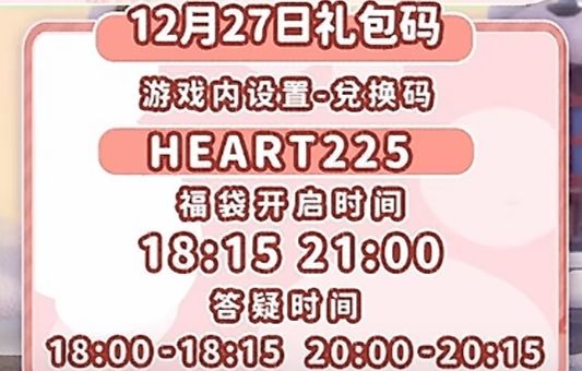 心动小镇2月12日 天气:晴 0-6 18-24下雪天 1.溜溜橡木:10号(溜溜木) 2.无暇萤石:3号(萤石) 3.今日礼包码:YUANXIAO 4.新春活动兑换码:NEWYEARBABU(内含100月光水晶) 雪天朵朵在文艺街,彩虹朵朵在彩虹方向,彩虹花束在朵朵附近和家! 18:00锦鲤钓鱼事件 19:00周末音乐会 每周泡泡 七个谜面点一下谜面再去找泡泡 谜面:圆月照玉阶 谜底:在中