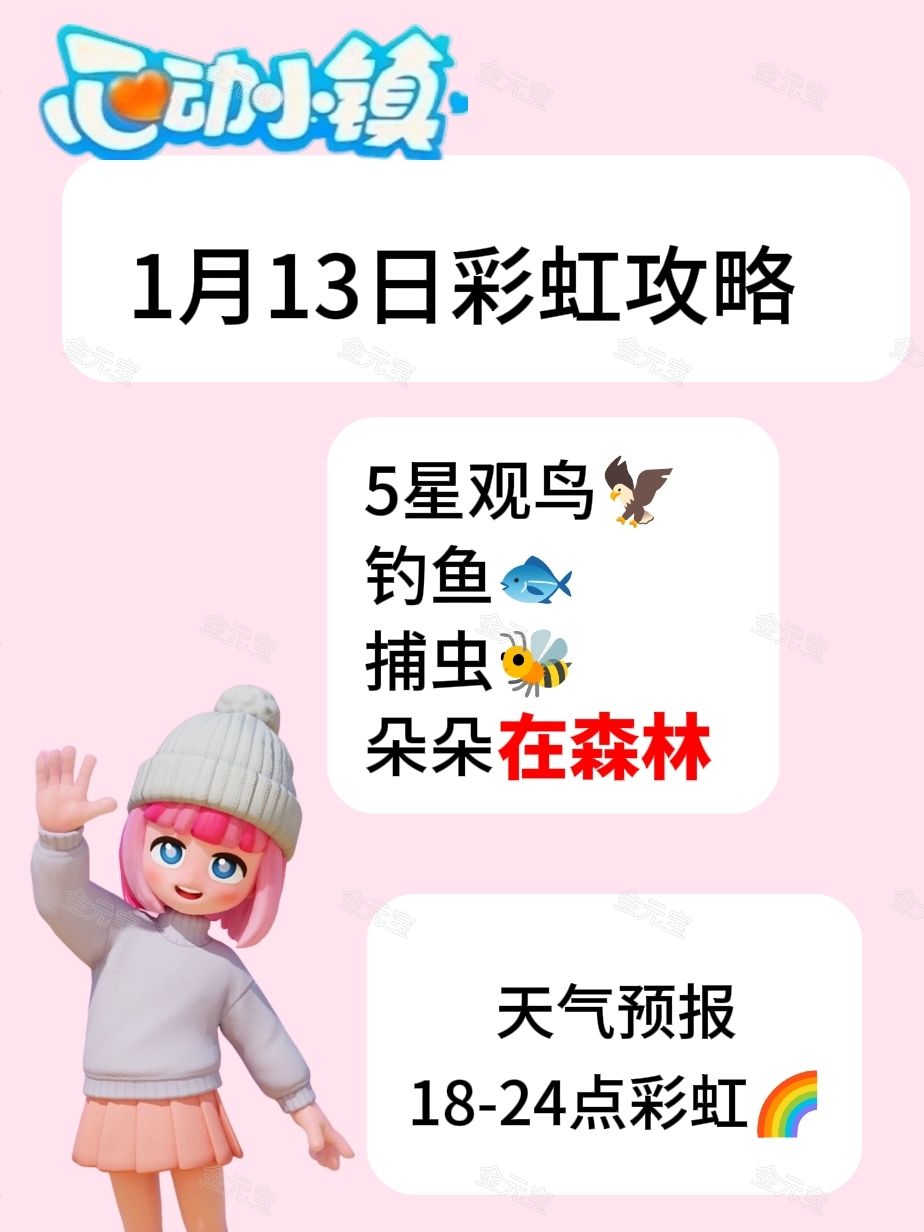 天气预报 18-24点彩虹🌈 ———————————— 5星观鸟🦅 钓鱼🐟 捕虫🐝 朵朵在市中心 —————————— ❄️雪天和雪景规律 天气预报有雨🌧️的那天, 就算那天一开始是晴天☀️ 整天地上也有积雪。 现在的雪天❄️是雨天🌧️变的, 只有空中飘雪❄️才是雪天(雨天)。 🌧️雨天朵朵和雨天的鱼、虫才会出现 🌧️雨天部分鸟才会张开翅膀。 #心动小镇 #心动小镇攻略 #心动小镇攻略征集#心动小镇线条小狗联动