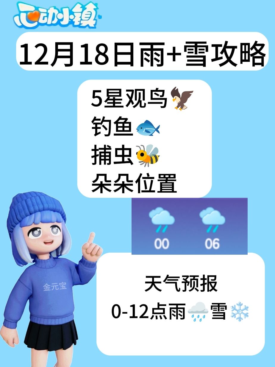 只有下雨天有雪 大家一定要拍照呀! —————— 5星观鸟🦅 钓鱼🐟 捕虫🐝 朵朵位置 —— —— 天气预报0-12点雨🌧️雪❄️ #心动小镇 #线条小狗在小镇 #心动小镇线条小狗联动