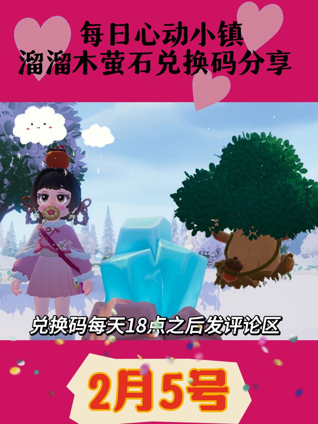 心动小镇2月5日 天气:晴 0:00-12:00下雪天/下雨天 1.溜溜橡木:6号(溜溜木) 2.无暇萤石:11号(萤石) 3.今日礼包码:18点左右更新 4.新春活动兑换码:NEWYEARBABU(内含100月光水晶) 雪天朵朵在文艺街,彩虹朵朵在彩虹方向,彩虹花束在朵朵附近和家! 全新卡池已上线,代购代售好友3级动作,新年快乐,小镇新春季新4种鞭炮虫,新黄金锦鲤,每周泡泡 #心