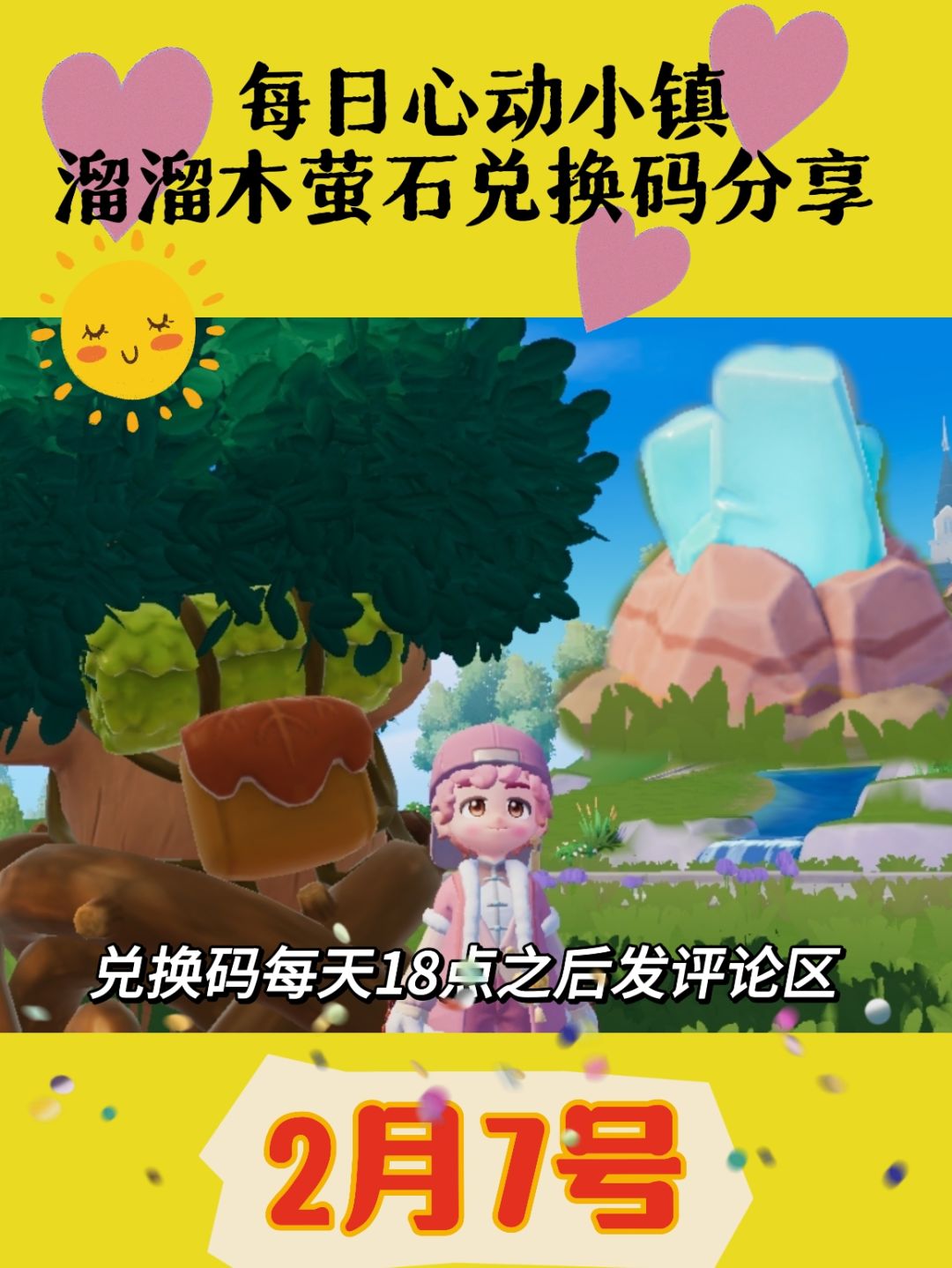 心动小镇2月7号 天气:晴 ☁️ 🪵溜溜橡木:11号(溜溜木) 💎无暇萤石:09号(萤石) 🦋今日迷面在安德鲁大树旁边(会飘) 🎊新春活动兑换码:NEWYEARBABU(内含100月光水晶)