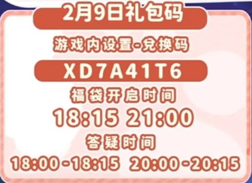 心动小镇2月9日 天气:晴 12-24点下雪天 1.溜溜橡木:灵橡松林(溜溜木) 2.无暇萤石:4号(萤石) 3.今日礼包码:XD7A41T6 4.新春活动兑换码:NEWYEARBABU(内含100月光水晶) 雪天朵朵在文艺街,彩虹朵朵在彩虹方向,彩虹花束在朵朵附近和家! 18:00锦鲤钓鱼事件 19:00周末音乐会 每周泡泡 谜面 圆月照玉阶 谜底 市中心市政府台阶处灌木丛 奖励 红豆汤圆