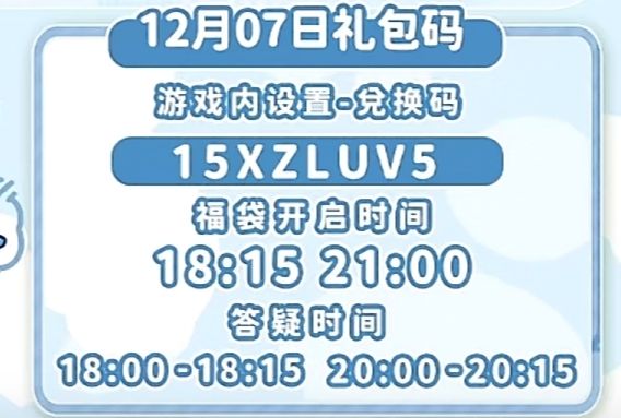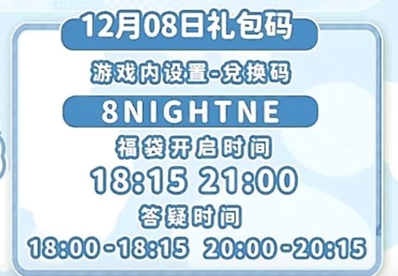 礼包码:待更新 天气:🌞 溜溜橡木12号 无瑕莹石6号房 活动时间表 12:00 海钓 21:00 海钓 11:00 引虫出洞 20:00 引虫出洞 【新春季音乐会】据说新春季音乐会的演奏团队里加入了新的朋友……?1月29日 - 2月4日(大年初一到初七)每晚19:00 - 20:00,2月8日至3月2日期间的每周六、日晚19:00 - 20:00,将会举办新春季音乐会,欢迎发展家们届时前往参加。