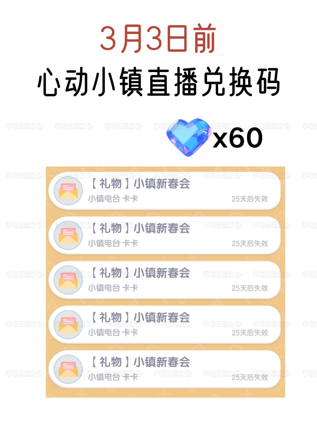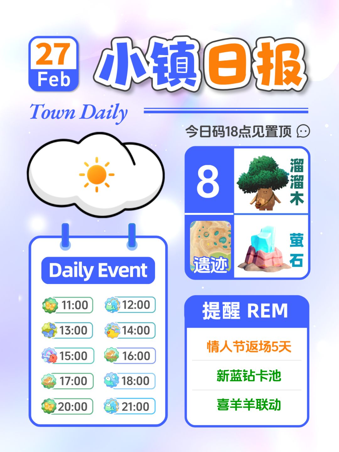 心动小镇 1月18日 星期日 小镇天气: 晴天 彩虹朵朵在森林,彩虹花在森林岛,朵朵附近和家 19日预计12-24周一下雨/下雪天 24日周六下雨/下雪天/流星雨星陨矿石 1.溜溜橡木:2号(溜溜木) 2.无暇萤石:2号(无瑕萤石) 3.今日兑换码:X8F5R7VW 4.月光水晶兑换码:瑞雪迎春版本前瞻 5.礼包码:124冰雪季等你 6.礼包码:喜羊羊要来啦 常驻(限时)活动事件: 11:00 引