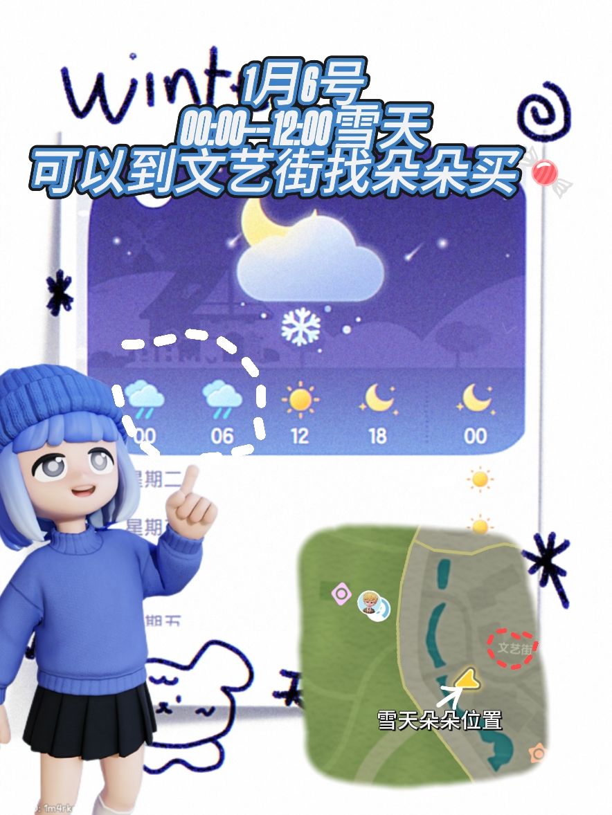 1月6号 天气:🌨️凌晨到12:00 朵朵的位置在文艺街 可以找朵朵买糖和收集 虫鸟鱼图鉴 下雪天雨天朵朵的糖果只会刷新青💚蓝💙紫💜三种#心动小镇创作计划 #心动小镇 #心动小镇朵朵 #心动小镇图鉴 #心动小镇下雪天