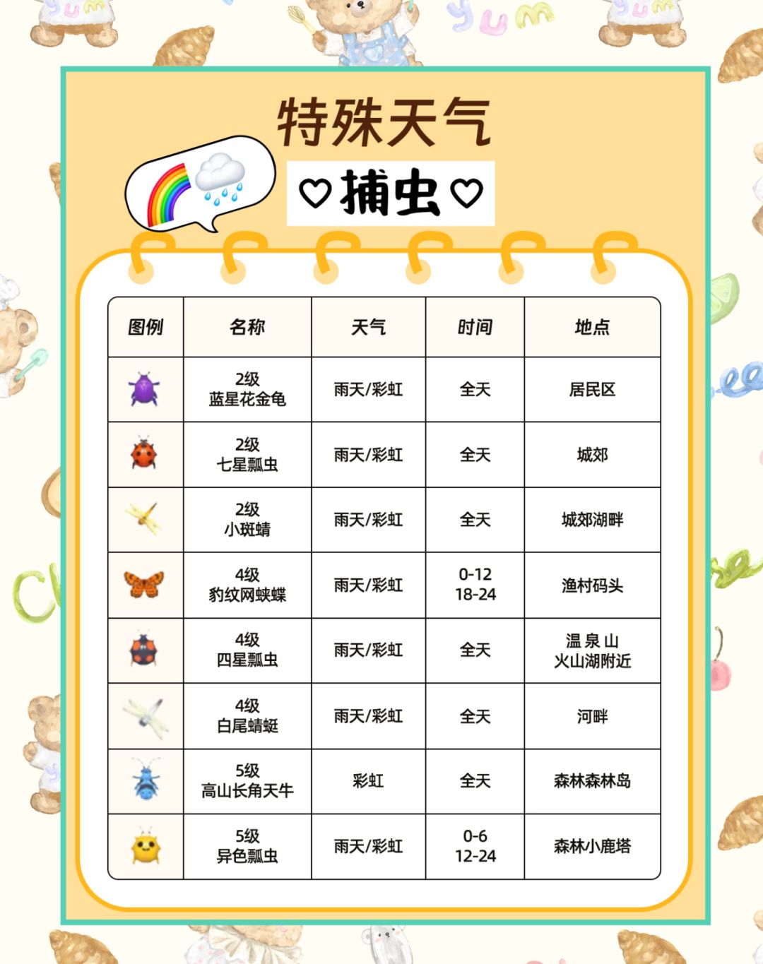 很久没针对萌新写帖子了~ 因为后期会插入到我的彩虹天雨天攻略上 所以专门做了下表格 里面包括了特殊天气会出现的常规钓鱼,观鸟,捕虫 新入坑宝宝们可以存一下图哦~ #心动小镇 #小镇奇灵夜季