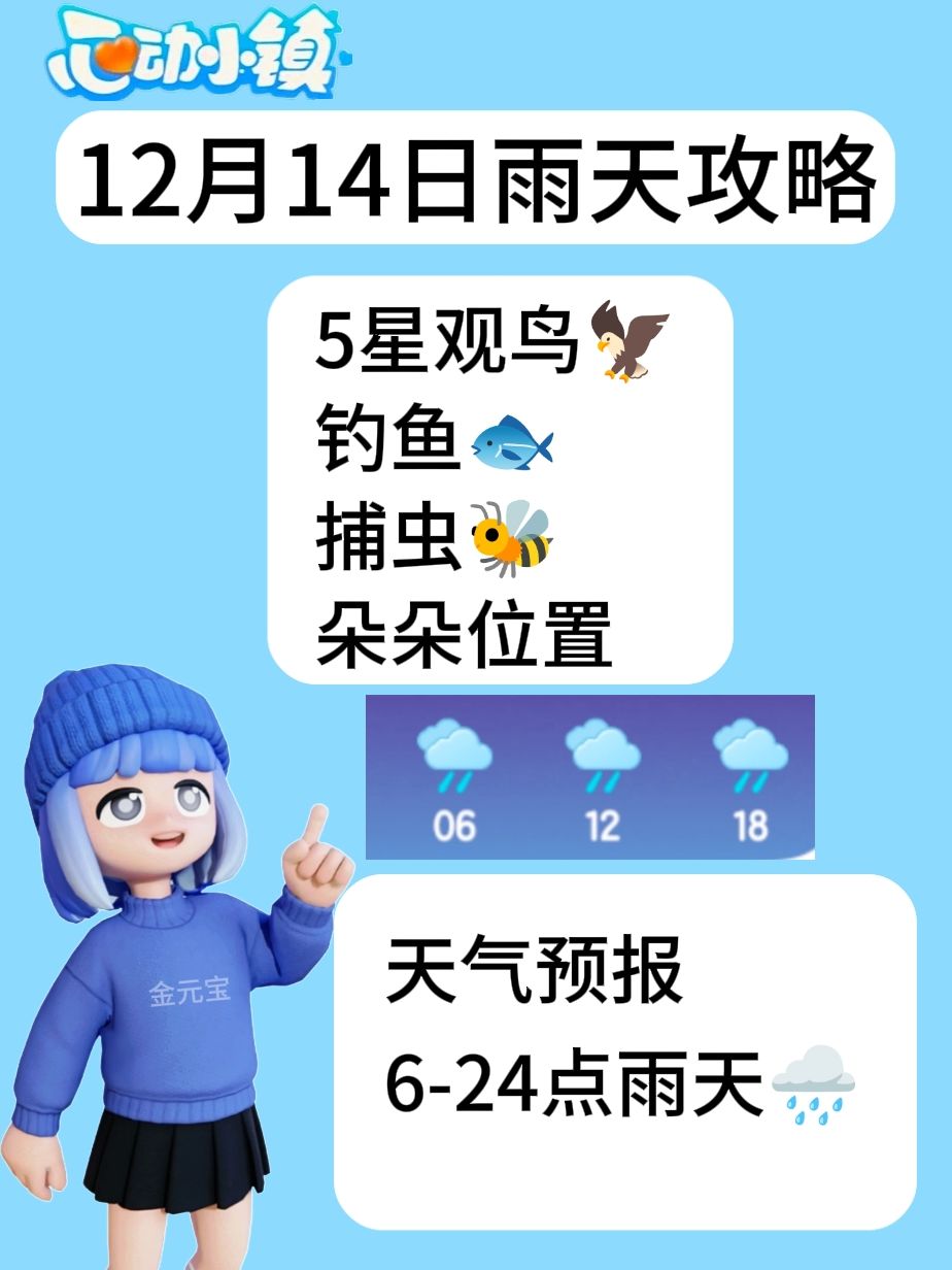 天气预报 6-24点雨天🌧️ —————— 5星观鸟🦅钓鱼🐟 捕虫🐝 朵朵位置 ———————— 建议明天雨天开启捕虫事件 #心动小镇