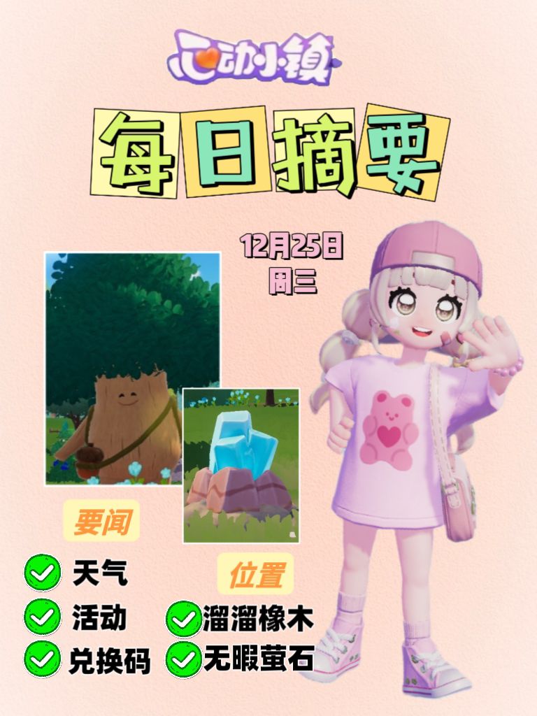 12月25日周三 天气:❄️12点-24点 雪天朵朵位置:文艺街(见图5) 🌲溜溜橡木:3号房 💎无瑕萤石:7号房 💰礼包兑换码:见评论(每日18点后更新) ❤️今日免费活动: 12点 海钓🎣 21点 海钓🎣 11点 引虫出洞🦋 20点 引虫出洞🦋 冬日活动(攻略见主页) 线条小狗旅行记 冬日寻宝 #心动小镇 #心动小镇创作计划 #心动小镇攻略